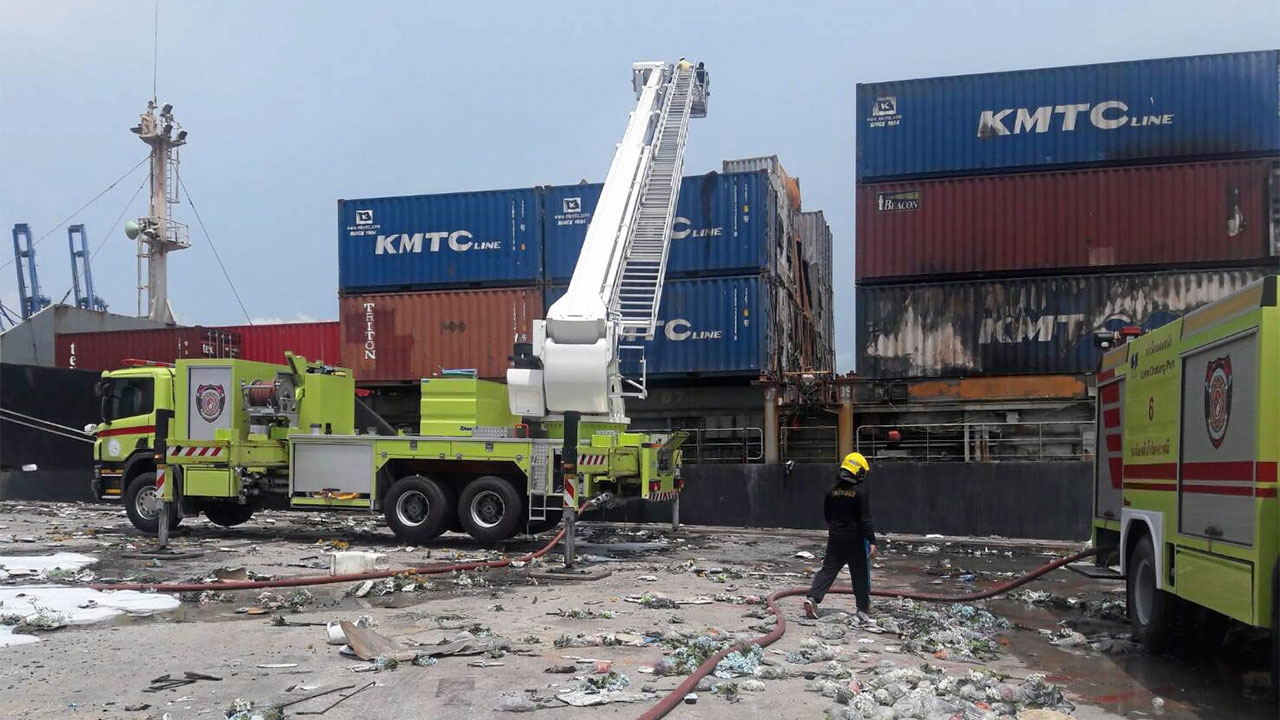 ความคืบหน้าการสอบสวนหาสาเหตุไฟไหม้ตู้สินค้าเมื่อเวลา 15.00 น. วันที่ 26 พ.ค. ที่ห้องประชุมสโมสรท่าเรือแหลมฉบัง ต.ทุ่งสุขลา อ.ศรีราชา จ.ชลบุรี เรือโทกมลศักดิ์ พรหมประยูร ผู้อำนวยการการท่าเรือแห่งประเทศไทย (กทท.) พร้อมด้วยเรือโทยุทธนา โมกขาว ผู้อำนวยการท่าเรือแหลมฉบัง ตัวแทนจากท่าเทียบเรือ เอ 2 ตัวแทนจากสำนักงานควบคุมการจราจรและความปลอดภัยทางทะเล กรมเจ้าท่า ตัวแทนจากกองทัพเรือภาคที่ 1 ตัวแทนจากศูนย์ควบคุมมลพิษ จ.ระยอง ตัวแทนจากสายการเดินเรือ และเจ้าหน้าที่ที่เกี่ยวข้อง ร่วมแถลงข่าวเหตุเพลิงไหม้บนเรือบรรทุกสินค้า KMTC HONGKONG