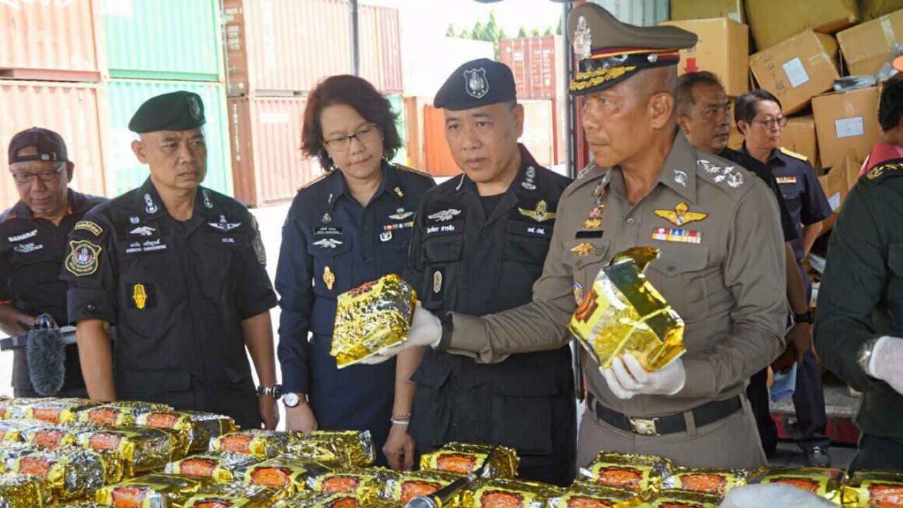พล.ต.อ.เฉลิมเกียรติ ศรีวรขาน รอง ผบ.ตร.และคณะแถลงข่าวจับกุมผู้ต้องหาชาวจีนและชาวไทย รวม 4 คน พร้อมของกลาง ยาไอซ์ 1,000 กก. หลังนำซุกซ่อนในกล่องรองเท้าหวังตบตาเจ้าหน้าที่เตรียม ส่งไปประเทศฟิลิปปินส์กับ ตู้คอนเทนเนอร์ที่ลานรับ ฝากตู้คอนเทนเนอร์ อ.ศรีราชา จ.ชลบุรี.