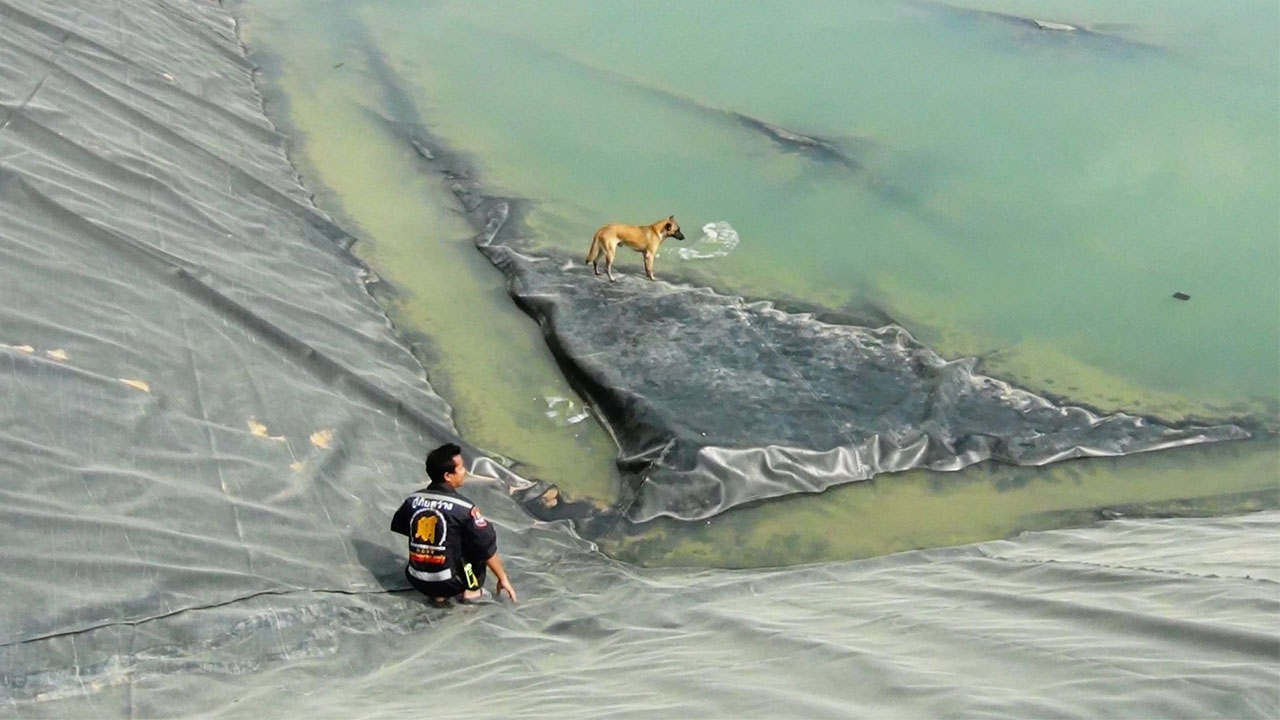 เจ้าหน้าที่กู้ภัยค่อยๆไต่ลงบ่อบำบัดน้ำเสียฟาร์มไก่ “คลองใหญ่” อ.บ้านบึง จ.ชลบุรี เพื่อช่วยเหลือสุนัขจรจัด “เจ้าบุญรอด” พลัดตกบ่อร่วมสัปดาห์จนอิดโรยเพราะขาดน้ำและอาหาร ก่อนอุ้มขึ้นจากบ่อได้อย่างปลอดภัย.