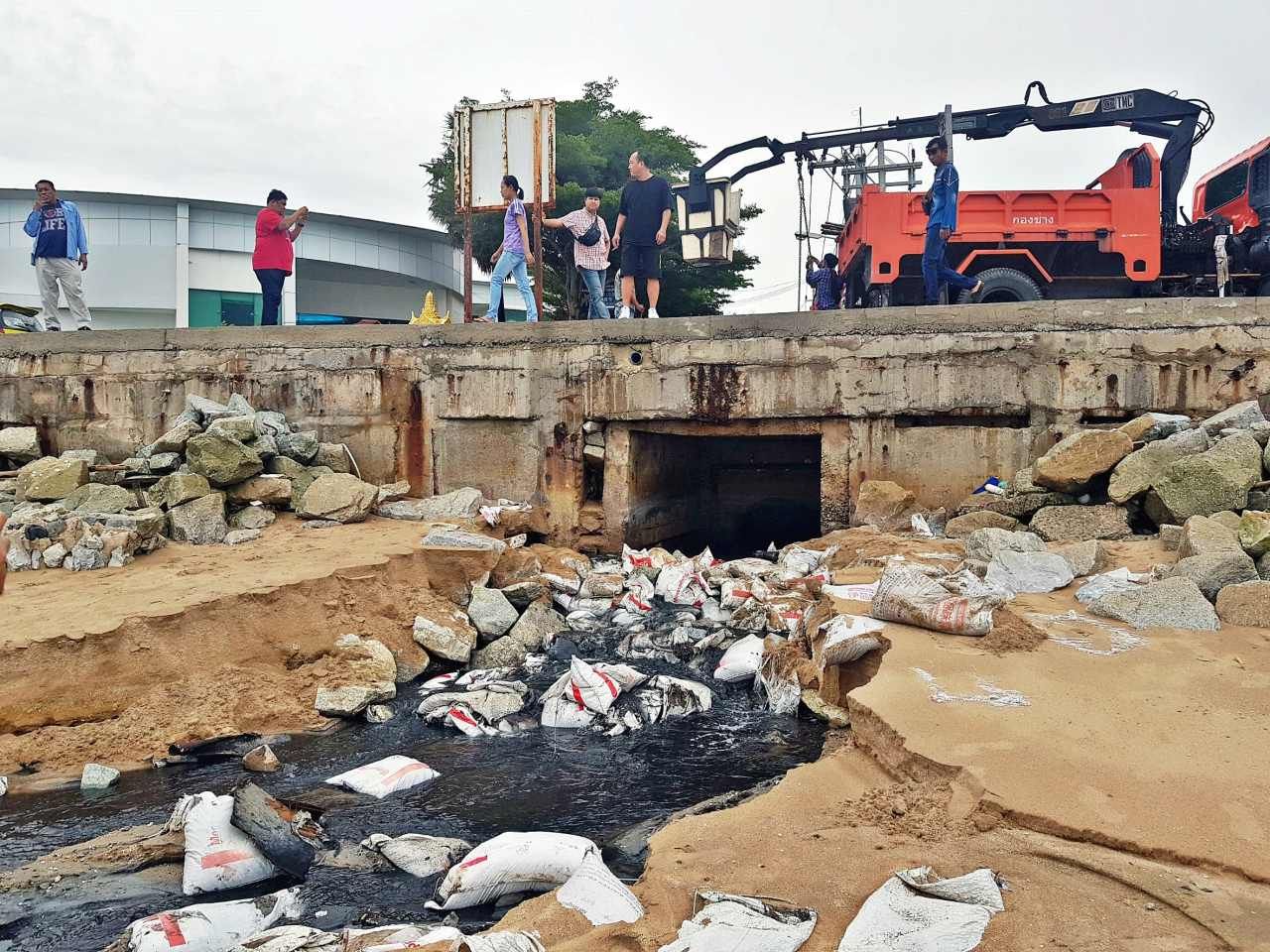 ล่าสุด วันที่ 5 ก.ค. ผู้สื่อข่าวได้รับรายงานว่า ช่วงสัปดาห์ที่ผ่านมาในพื้นที่เมืองพัทยา และใกล้เคียง ได้เกิดพายุฝนตกลงมาอย่างต่อเนื่อง ทำให้น้ำในท่อระบายของเทศบาลนาจอมเทียนที่ยังไม่ได้ดำเนินการต่อเชื่อมกับระบบบำบัดน้ำเสียของเมืองพัทยา เอ่อล้นและไหลทะลักพังแนวกระสอบทรายที่ปิดกั้นไว้บริเวณชายหาดซอยใกล้เคียงร้านอาหารปูเป็น อ.สัตหีบ จ.ชลบุรี โดยพบว่าน้ำยังคงมีสีดำขุ่น และมีกลิ่นเหม็นเน่ารุนแรงเช่นเดิม