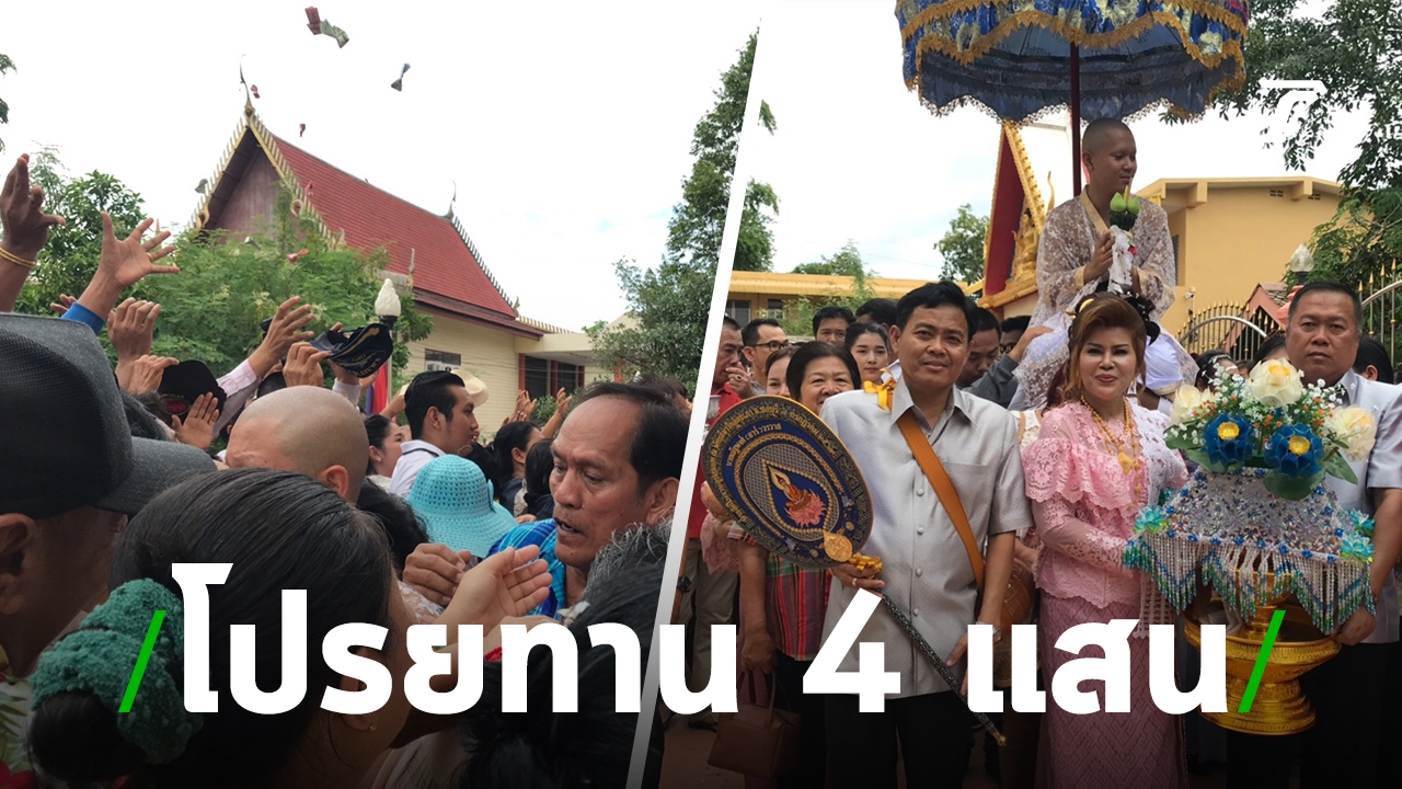 คนเมืองชลฯ ไปร่วมงานบวชนาคลูกชายคนเดียว ลูกชายอดีตเลขานุการนายกเทศมนตรีฯ แย่งรับ "เงินโปรยทาน" ที่เจ้าภาพจัดหนัก ใส่มาทั้งแบงก์ 1,000 แบงก์ 500 แบงก์ 100 มากถึง 4 แสน