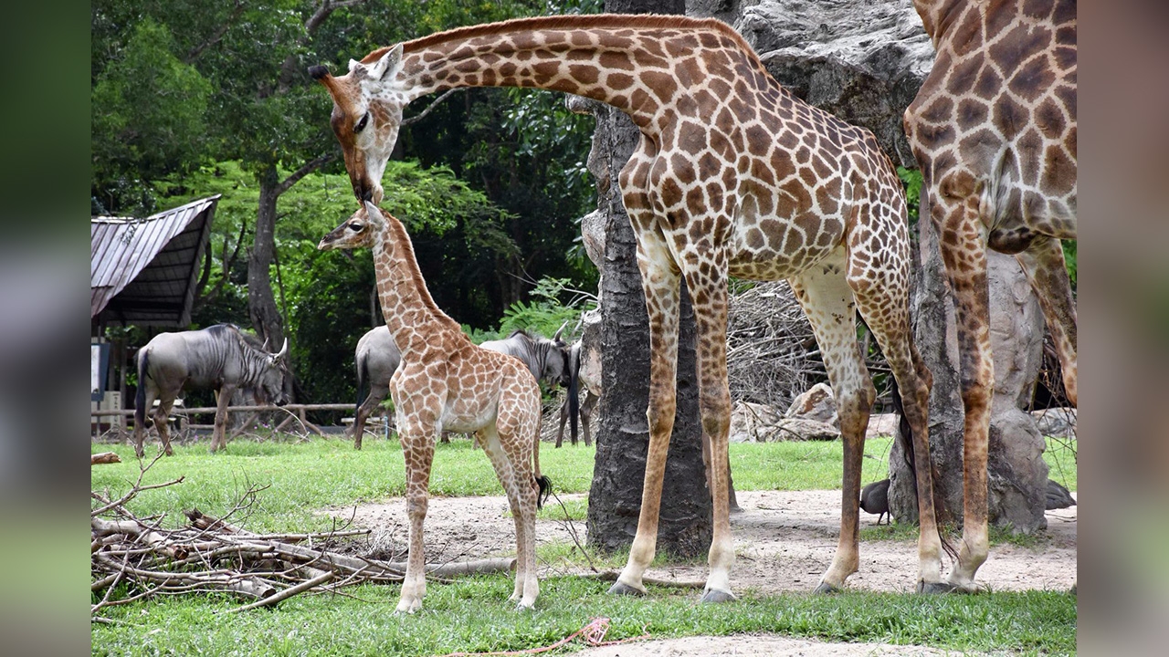 ลูกยีราฟเดินคลอเคลีย ใกล้กับพ่อแม่ไม่ยอมห่าง เพิ่งเกิดมาเป็นสมาชิกใหม่ของสวนสัตว์เปิดเขาเขียว อ.ศรีราชา จ.ชลบุรี เชิญชวนนักท่องเที่ยวร่วมโหวตชื่อน้ำตาล หรือเมญ่า ผ่านทางเฟซบุ๊กของสวนสัตว์ฯ เพื่อลุ้นรางวัล ถึงวันที่ 19 ก.ค. ประกาศผลวันที่ 1 ส.ค.