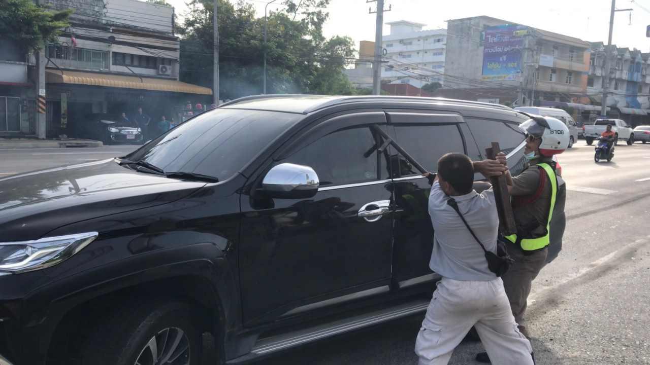พบ รถยนต์มิตซูบิชิ ปาเจโร่ สีดำ ทะเบียนป้ายแดง ข 5764 ชลบุรี จอดเครื่องยนต์ติดอยู่คนขับนั่งหลับอยู่บนเบาะที่นั่งคนขับ จึงเคาะกระจกประตูรถปลุกแต่ไม่ยอมตื่นนานกว่า 20 นาที เกรงว่าจะเสียชีวิต ประกอบกับรถเริ่มไหล จึงนำหินมาวางหนุนล้อรถไว้ และตัดสินใจใช้เหล็กทุบหน้าต่างประตูฝั่งตรงข้ามคนขับจนแตก แต่คนขับก็ยังไม่ตื่น จึงเขย่าตัวจนกระทั่งตื่น