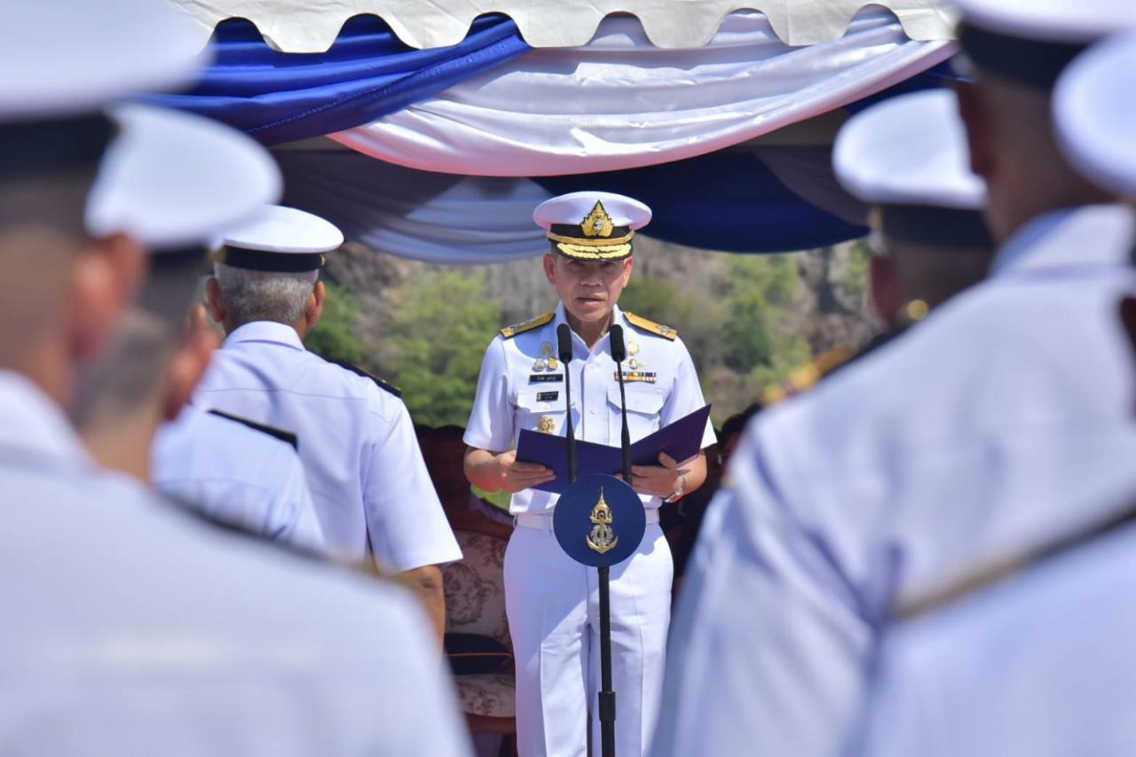 โอกาสนี้ ผู้บัญชาการทหารเรือ ได้ให้โอวาทแก่กำลังพลประจำเรือหลวงประจวบคีรีขันธ์ความว่า "กองทัพเรือได้รับเรืออีกลำหนึ่งที่ต่อโดยคนไทย 100% เป็นการเดินตามรอยเบื้องพระยุคลบาท พระบาทสมเด็จพระบรมชนกาธิเบศร มหาภูมิพลอดุลยเดชมหาราช บรมนาถบพิตร ที่ได้ทรงวางรากฐานตั้งแต่ เรือ ต.91 มาสู่เรือตรวจการณ์ไกลฝั่งที่มีระวางขับน้ำกว่า 2000 ตัน ในปัจจุบันซึ่งมีความใกล้เคียงกับเรือฟริเกต เรือในกองทัพเรือมีเรือหลายประเภทหลายลำ แต่เรือเป็นเพียงเครื่องมือประการหนึ่งแต่คนต่างหากที่สำคัญกว่า ความสอดคล้องระหว่างเครื่องมือกับคน แต่คนต้องเก่งก่อนต้องมีความรู้ความสามารถจึงจะใช้อย่างมีคุณภาพ วันนี้วันเริ่มต้นของการใช้เรือเริ่มจากศูนย์ เกียรติยศไม่ได้มีมาแต่ชาติกำเนิดแต่เกิดจากการกระทำ จะได้เกียรติหรือไม่ควรจะช่วยกันคนละไม้คนละมือ ลงความคิดความรู้ก็ทำให้เจริญรุ่งเรืองสืบต่อไป "