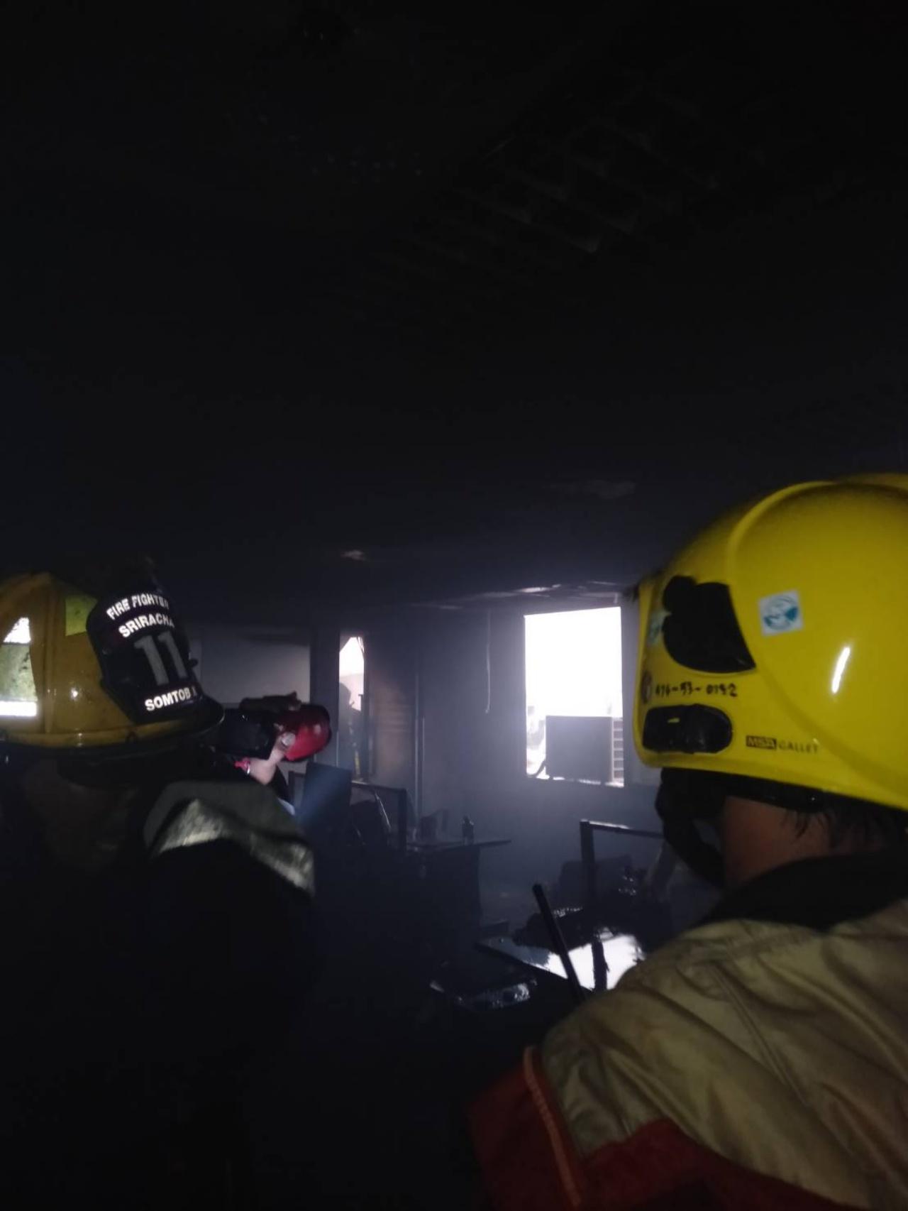 สปริงเกอร์ทำงาน 100% สยบเพลิงลุกไหม้กลางตึกสำนักงานทะเลทองทาวเวอร์ แหลมฉบัง ตรวจสอบพบต้นเพลิงจากห้องคอมพิวเตอร์ ของออฟฟิศเช่า ตร.คาดสาเหตุอาจมาจากไฟฟ้าลัดวงจรบนโต๊ะคอมพิวเตอร์