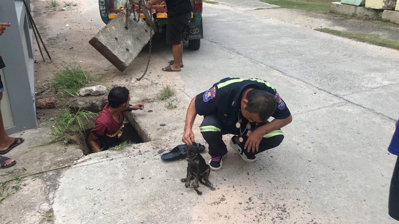 จนท.กู้ภัยเมืองชล ช่วยกันงัดท่อระบายน้ำในหมู่บ้านที่ศรีราชา เพื่อช่วยลูกสุนัขพันธุ์ไทยผสมเพศผู้ หลังวิ่งเล่นซุกซนแล้วตกไปในท่อระบายน้ำ ติดคานานกว่า 2 วัน เอาขึ้นมาได้นั่งนิ่งหนาวสั่น น่าเอ็นดู