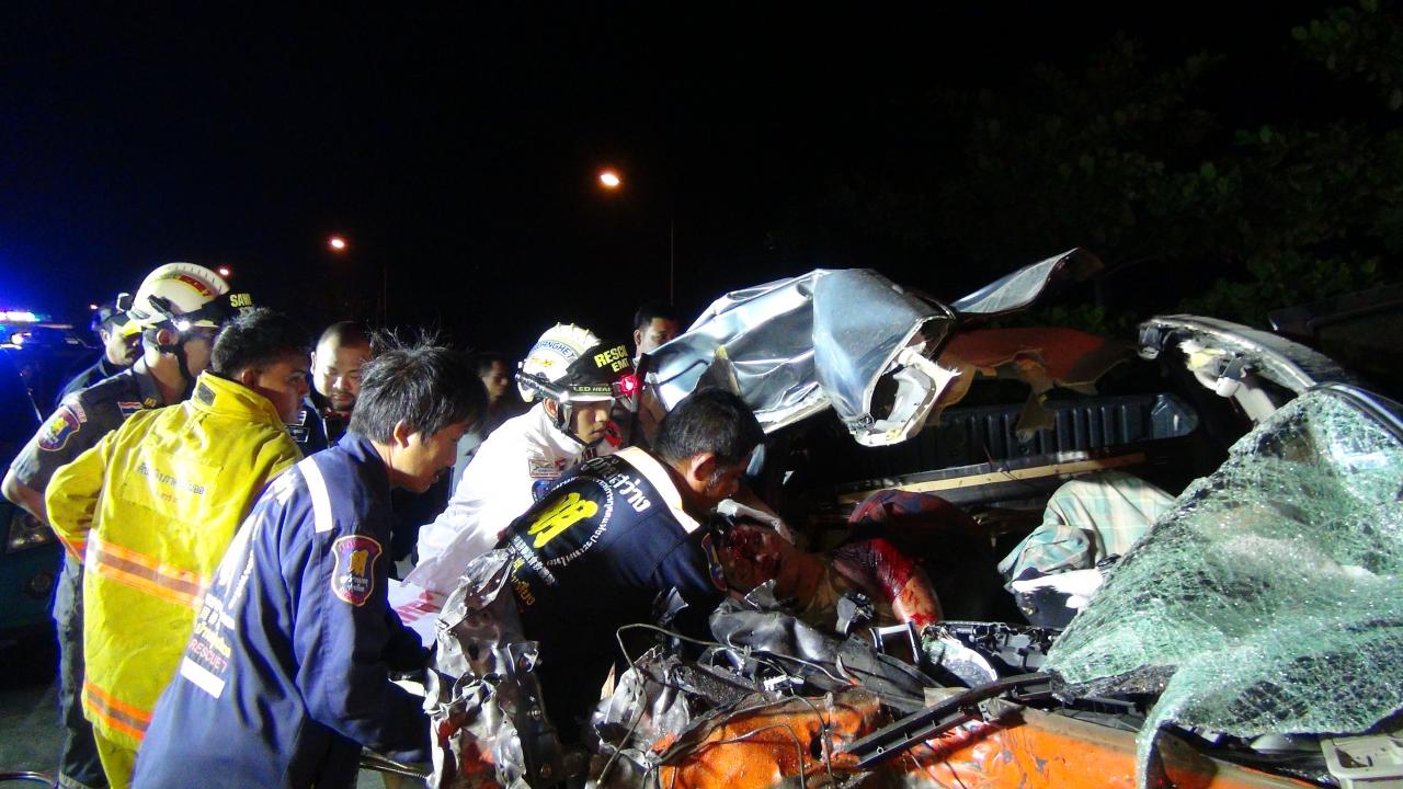 เมื่อเวลา 02.00 น. วันที่ 9 พ.ย.62 ร.ต.ท.จิรายุทธ โขขุณิ รอง สว.สอบสวน สภ.พนัสนิคม ได้รับแจ้งจากศูนย์วิทยุหน่วยกู้ภัยสว่างเหตุบ้านทุ่งเหียง พนัสนิคม ว่าเกิดอุบัติเหตุรถกระบะชนท้ายรถบรรทุก บริเวณสี่แยกไฟแดงเนินหิน ทำให้มีผู้เสียชีวิตในที่เกิดเหตุ หลังรับแจ้งจึงรีบรุดเข้าตรวจสอบพร้อมอาสากู้ภัย เบื้องต้นที่เกิดเหตุอยู่บนถนนสาย 331 กบินทร์บุรี - สัตหีบ (ขาเข้าสัตหีบ) ตรงสัญญาณไฟสี่แยกเนินหิน หมู่ 7 ตำบลหนองเหียง อำเภอพนัสนิคม จังหวัดชลบุรี พบรถยนต์กระบะยี่ห้อ อีซูซุ สีเทา 4 ประตู ทะเบียน กท 474 ฉะเชิงเทรา สภาพชนอัดก็อปปี้ติดกับรถบรรทุก 6 ล้อ ยี่ห้ออีซูซุ หัวสีแดง ทะเบียน 86 – 2554 นครราชสีมา กู้ภัยเร่งนำอุปกรณ์ตัดถ่างตัดเหล็กประตูเพื่อนำร่างผู้บาดเจ็บออกมา แต่เนื่องจากมีบาดแผลฉกรรจ์หลายแห่ง เสียเลือดจำนวนมาก ทนพิษบาดแผลไม่ไหว เสียชีวิตบนที่นั่งคนขับ