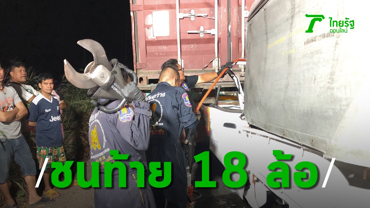 ที่ชลบุรี เกิดอุบัติเหตุรถกระบะพุ่งชนอัดติดท้ายรถบรรทุกพ่วง 18 ล้อ ทำให้คนขับและเพื่อนที่มาด้วยกันเสียชีวิตอนาถคาซากรถ 2 ราย