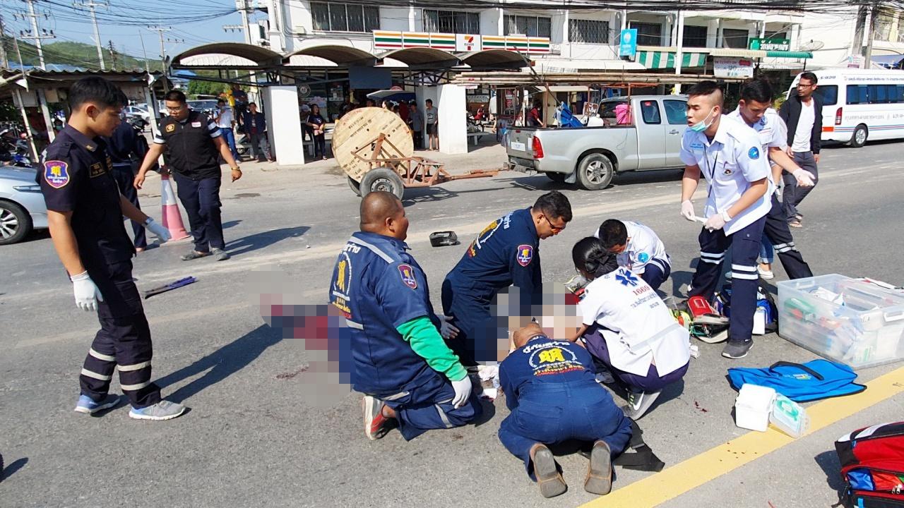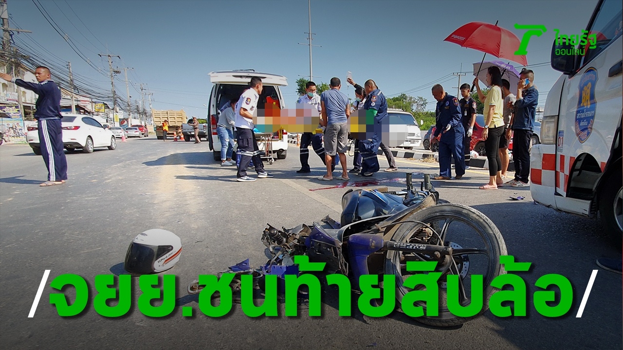 ลุงทหารเรือวัย 58 ขี่ จยย.ชนท้ายรถสิบล้อบรรทุกดิน รถพังยับอาการสาหัส หมดสตินอนจมกองเลือดบนถนนทางเข้าสนามกอล์ฟพลูตาหลวง กู้ภัยเร่งยื้อชีวิตก่อนส่ง รพ.ตร.เร่งดูวงจรปิดหาสาเหตุ