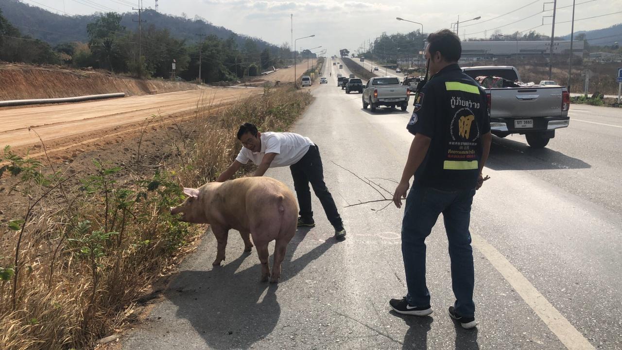 คนขับรถกระบะขนหมู กล่าวอีกว่า ส่วนตนเองและลูกน้องได้รับบาดเจ็บเล็กน้อย โดยเหตุการณ์นี้ส่งผลทำให้รถของประชาชนที่สัญจรผ่านต้องติดกันยาวนับกิโลเพราะกู้ภัยต้องช่วยกันไล่ต้อนหมูที่วิ่งหนีและบาดเจ็บ เพื่อไปรวมกันที่ข้างถนนเพราะอาจเกิดอันตราย โดยใช้เวลาประมาณ 1 ชั่วโมงจึงต้อนหมูทั้ง 14 ตัวให้อยู่ในพื้นที่ ที่ปลอดภัย และการจราจรกลับเข้าสู่ปกติ ยังงงกับเหตุที่เกิดขึ้น เนื่องจากรถที่ใช้บรรทุก ใช้งานยังไม่นานเท่าไร และยางก็เพิ่งจะเปลี่ยนมาไม่นาน ตอนรถเสียหลักจากอีกเลนไปยังอีกเลน ก็ไม่โดนรถคันอื่นๆ ในความโชคร้ายก็ยังมีความโชคดีอยู่