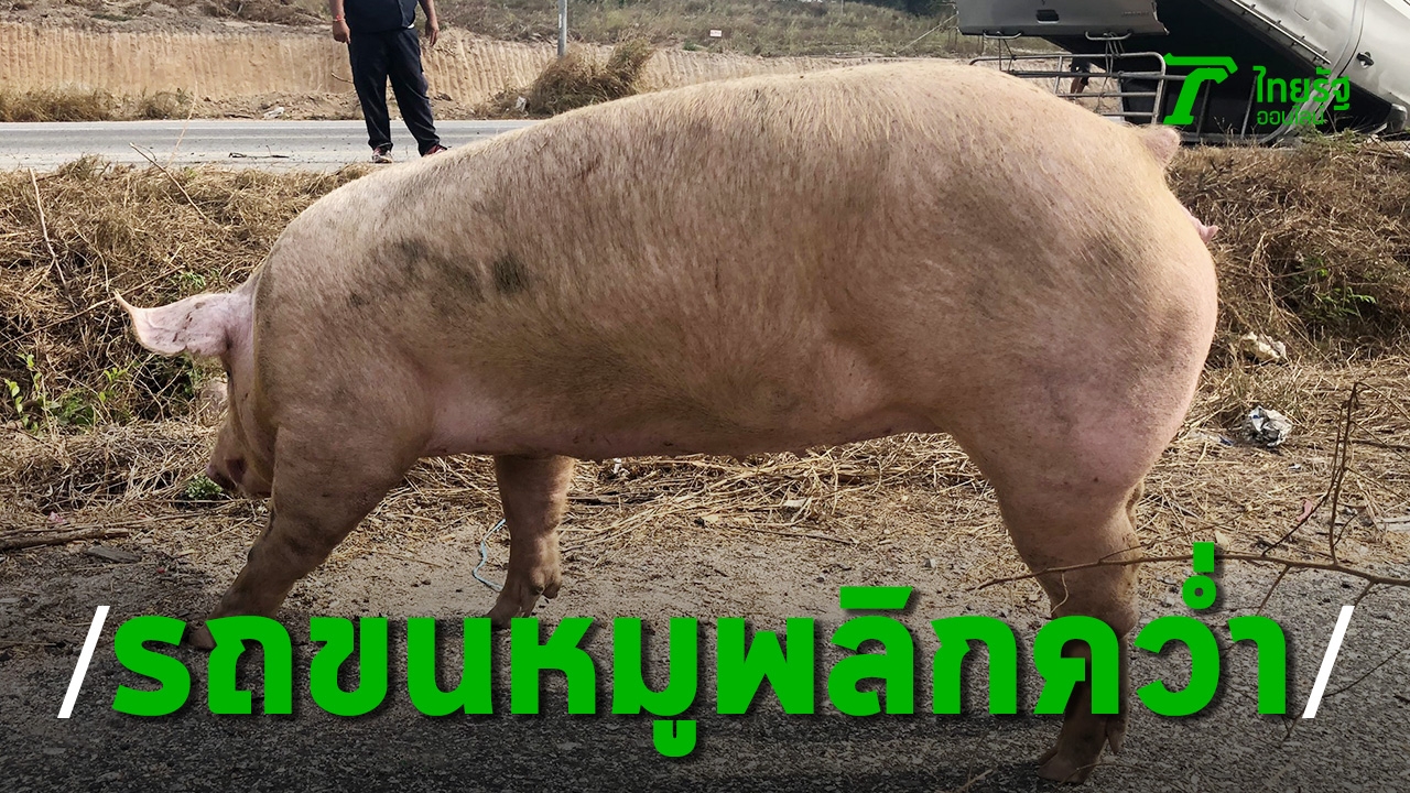 รถกระบะบรรทุกหมูส่งโรงเชือด ยางระเบิดรถพลิกคว่ำกลางถนนที่ อ.บ้านบึง ทำให้หมูที่บรรทุกมาตกกลางถนน ทำเอาจราจรติดขัดยาวหลายกิโลเมตร คาดสาเหตุจากบรรทุกหมูมาน้ำหนักเกิน