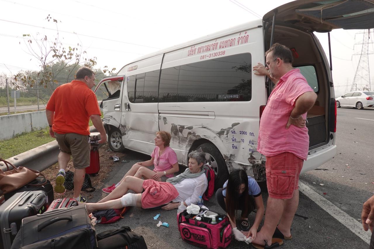 เมื่อวันที่ 11 ม.ค.63 พ.ต.ท.นักรบ ศิริพันธ์ สว.(สอบสวน) ทางหลวงที่ 2 กองกำกับการ 8 ทางหลวง มอเตอร์เวย์ จุดพักรถเขาดิน พร้อมหน่วยกู้ภัยฉะเชิงเทรา รับแจ้งอุบัติเหตุผู้ได้รับบาดเจ็บหลายราย บนถนนมอเตอร์เวย์ กม.52 ขาเข้าชลบุรี หมู่ 7 ต.เขาดิน อ.บางปะกง จ.ฉะเชิงเทรา พบรถตู้ โตโยต้า คอมมิวเตอร์ สีขาว ทะเบียน 33-6902 กรุงเทพมหานคร เสียหลักชนราวเหล็กข้างทาง ด้านหน้าพังเสียหาย มี นายวรชัย วงศ์คำตุ้ย อายุ 52 ปี เป็นคนขับ แล้วทำให้นักท่องเที่ยวชาวฝรั่งเศส 7 คนและชาวไทย 1 คน ที่โดยสารมาได้รับบาดเจ็บทั้งหมด เจ้าหน้าที่ทำการปฐมพยาบาลก่อนนำส่งโรงพยาบาลจุฬารัตน์ 11