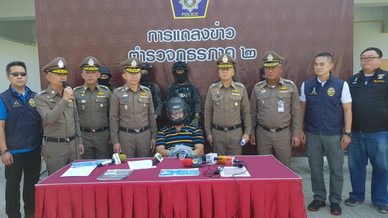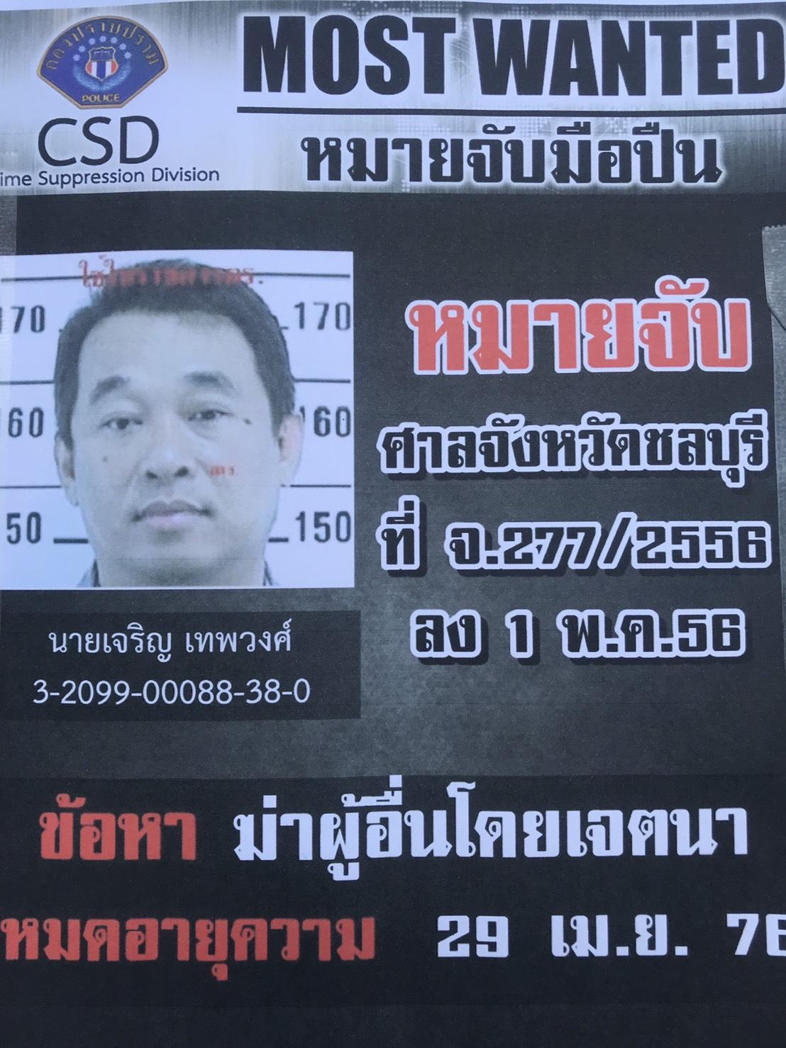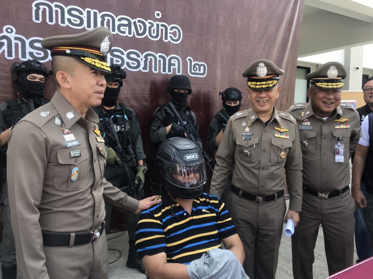 พล.ต.ท.มนตรี ยิ้มแย้ม ผบช.ภ.2 แถลงว่า ผู้ต้องหารายนี้ชื่อ นายเจริญ เทพวงศ์ อายุ 54 ปี ผู้ต้องหาตามหมายจับคดีสำคัญ จำนวน 4 หมาย ดังนี้ 1, หมายจับศาลจังหวัดชลบุรี ที่ 277/ 2556 ลง 1 พ.ค.56 ข้อหา "ฆ่าผู้อื่นโดยเจตนาและมีอาวุธปืนๆ" สภ.เมืองชลบุรี 2. หมายจับศาลจังหวัดฉะเชิงเทราที่ 301/2557 ลง 23 ก.ค.2557 ข้อหา "ร่วมกันปล้นทรัพย์โดยมีอาวุธปืนและโดยใช้ยานพาหนะเพื่อสะดวกแก่การกระทำความผิดฯ" (สภ.บางปะกง) 3. หมายจับศาลจังหวัดชลบุรี ที่ 344/2557 ลง 15 ส.ค.57 ข้อหา "ปล้นทรัพย์โดยมีและใช้อาวุธปืน โดยใช้ยานพาหนะเพื่อสะดวกแก่การกระทำผิดฯ" สภ.เมืองชลบุรี และ 4. หมายจับศาลจังหวัดชลบุรี ที่ 112/2558 ลง 11 มี.ค.58 ข้อหา "มีอาวุธปืนและเครื่องกระสุนปืนไว้ในครอบครองโดยไม่ได้รับอนุญาต" สภ.เมืองชลบุรี