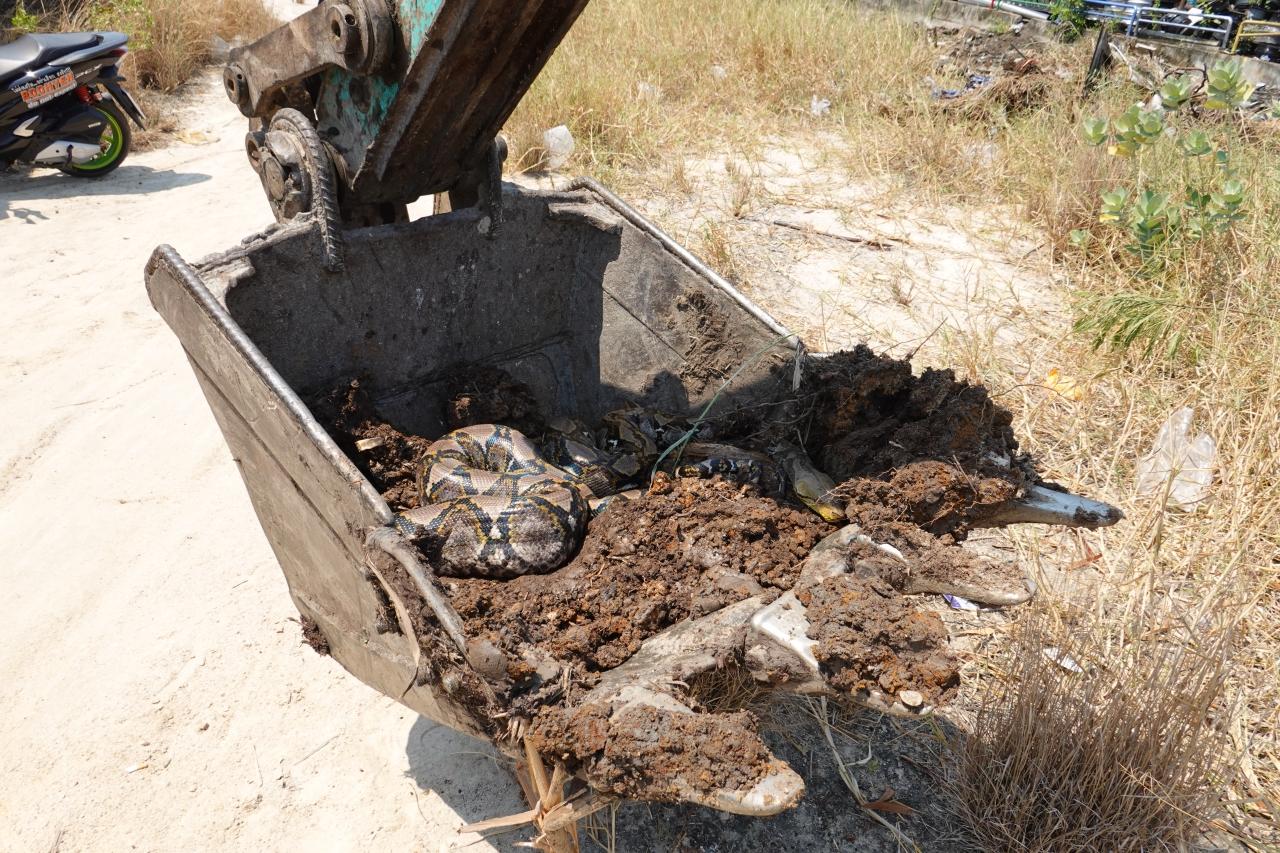 คนขับแบ็กโฮ เล่านาทีเจองูเหลือม 4 เมตร เลื้อยเข้ามาหาขณะปรับพื้นที่เตรียมถมดิน ก่อนตัดสินใจใช้บุ้งกี๋ตักแล้วแจ้งกู้ภัยมาจับ