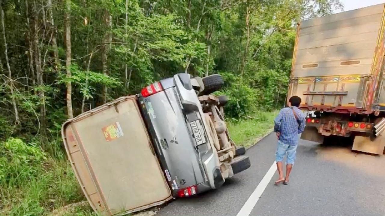 ช้างป่าจอมแสบ เขาอ่างฤาไน สุดเกเรเดินปรี่ใช้งางัดรถกระบะส่งสินค้า ที่วิ่งผ่านเส้นทาง 3259 จนพลิกคว่ำตระแคงตกข้างทาง ทำคนในรถบาดเจ็บ 1 ราย จนท.รุดช่วยเหลือ นำส่ง รพ. พร้อมเคลียร์เส้นทางสัญจรปกติ ฝากเตือนระมัดระวัง ทำตามกฎอย่างเคร่งครัด เพื่อความปลอดภัยทั้งคน-สัตว์