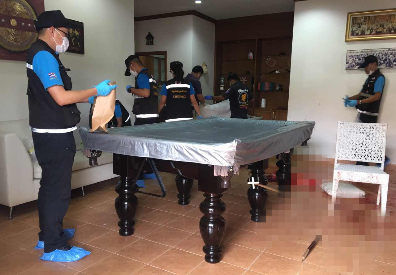 ที่เกิดเหตุเป็นทาวน์เฮาส์ชั้นเดียว ภายในบ้านพบร่องรอยการต่อสู้ มีคราบเลือดอยู่บนพื้นและสาดกระเซ็นติดฝาผนังจำนวนมาก บริเวณโดยรอบพบ ไม้คิวสภาพหัก และมีดสปาร์ตายาวประมาณ 60 เซนติเมตร มีคราบเลือดติดอยู่ ส่วนในห้องน้ำยังพบร่างผู้หญิงสาวทราบเพียบชื่อเล่น คือ น.ส.ออน อายุประมาณ 35-40 ปี มีบาดแผลถูกฟันที่ต้นคอ ข้อมือข้างขวา เป็นแผลฉกรรจ์ เจ้าหน้าที่ได้กันคนที่ไม่เกี่ยวข้องออกจากที่เกิดเหตุ
