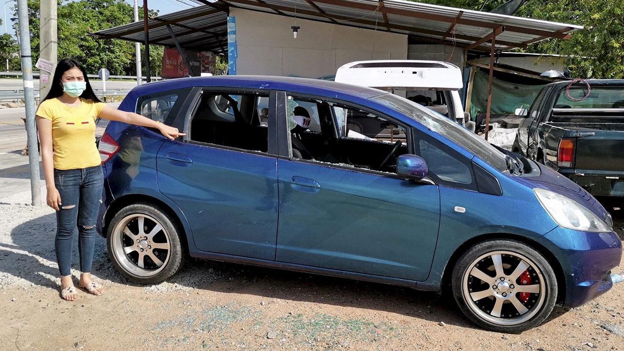 น.ส.ทิพย์ธิดา ไชยสัตย์ ลูกสาวเจ้าของร้านขายของชำ เลขที่ 407/1 หมู่ 1 ต.บางละมุง อ.บางละมุง จ.ชลบุรี ชี้ให้ดูสภาพรถเก๋งถูกกลุ่มวัยรุ่นนับสิบคนใช้มีดและไม้เบสบอลทุบจนได้รับความเสียหาย รวมถึงบุกเข้าไปทำลายทรัพย์สินภายในร้าน คาดสาเหตุไม่ยอมขายเหล้าในช่วงเวลาเคอร์ฟิว ทำให้กลุ่มวัยรุ่นบันดาลโทสะก่อเหตุ.