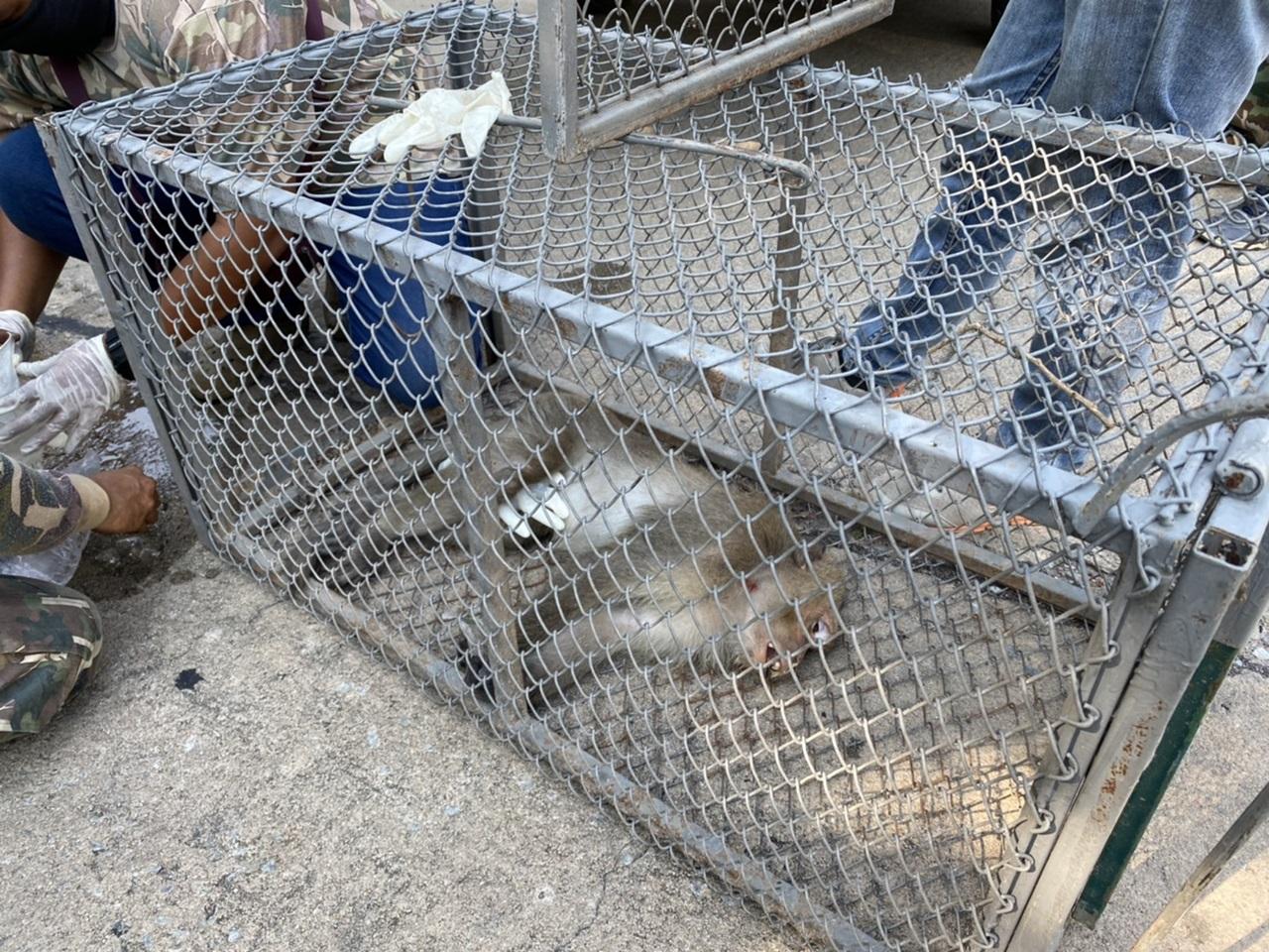เมื่อไปถึงพบเจ้าลิงแสม เพศผู้ อายุประมาณ 2 ปี กำลังแอบเข้าไปขโมยทุเรียน ไข่ไก่ ภายในบ้านของชาวบ้าน เจ้าหน้าที่จึงล้อมจับ แต่เจ้าลิงแสมเกิดไหวตัวทัน วิ่งหนีปีนขึ้นหลังคาทั่วหมู่บ้าน จนกระทั่งหลบหนีเข้าไปจนมุมที่อาคารของบริษัทเทพประสิทธิ์ มาร์เก็ตติ้ง จำกัด