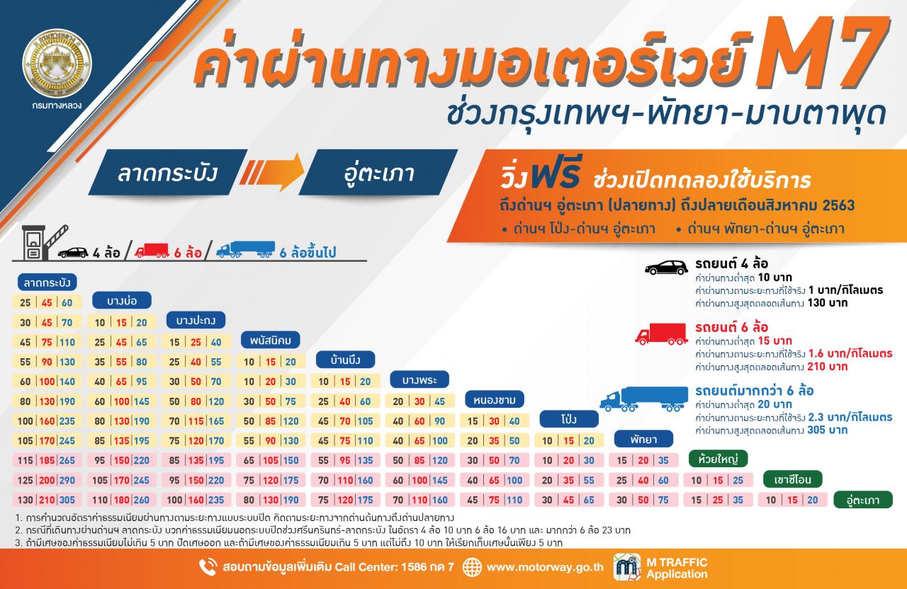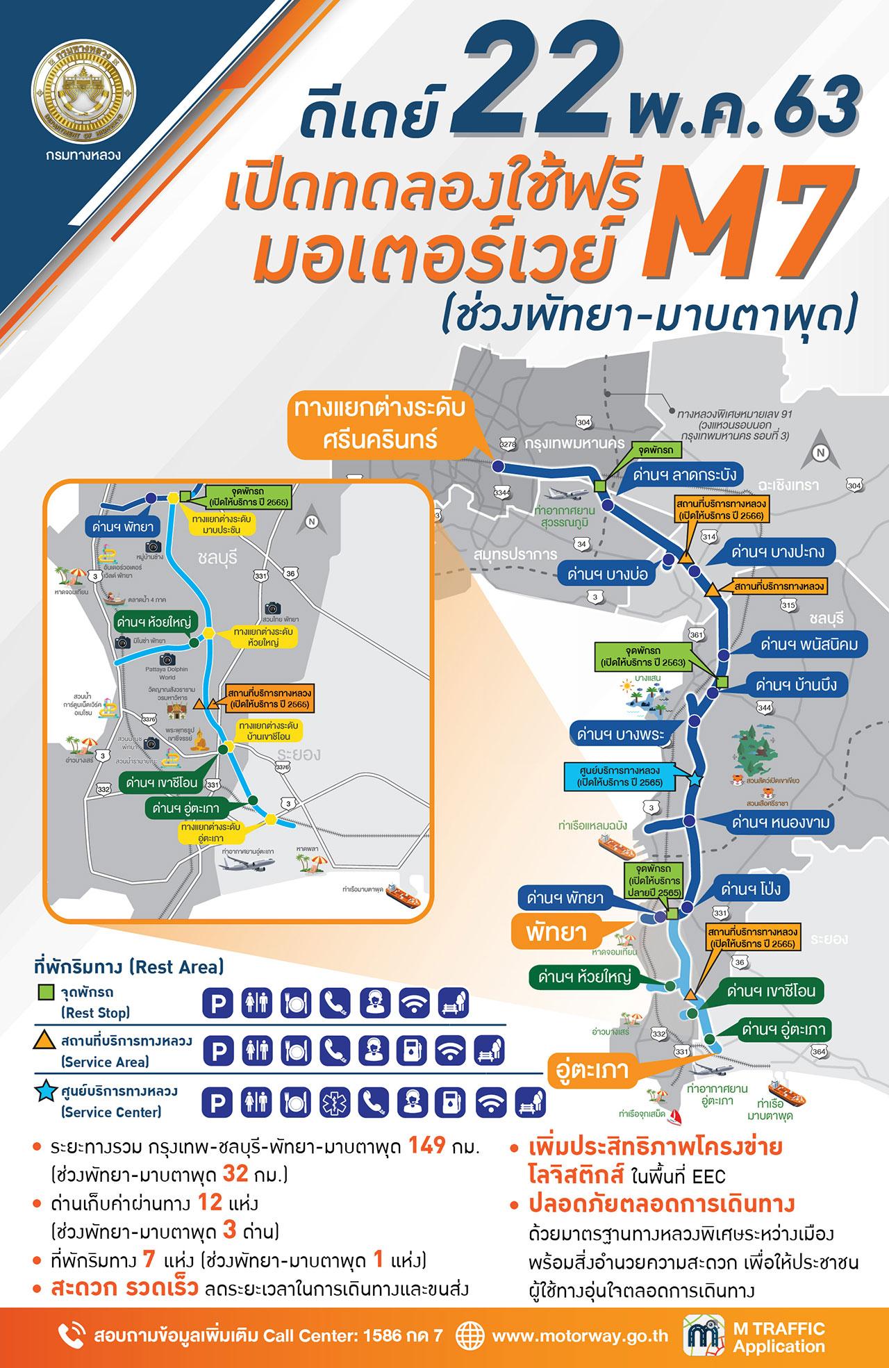 กรมทางหลวง จะเปิดทดลองให้ใช้บริการทางหลวงพิเศษระหว่างเมือง หมายเลข 7 สายกรุงเทพฯ-บ้านฉาง ส่วนต่อขยายช่วงพัทยา-มาบตาพุด ฟรี โดยไม่เก็บค่าธรรมเนียมผ่านทางเพิ่ม ตั้งแต่วันที่ 22 พ.ค.63 จากนั้นจึงจะเรียกเก็บในอัตราใหม่ (ช่วงพัทยา-มาบตาพุด) ในช่วงเดือนกันยายนเป็นต้นไป