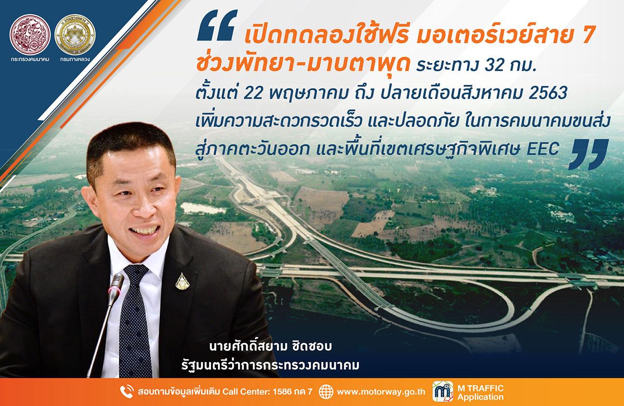 เมื่อวันที่ 17 พ.ค.63 นายศักดิ์สยาม ชิดชอบ รมว.คมนาคม เปิดเผยว่า กระทรวงคมนาคมมีนโยบายให้ทุกหน่วยงานในสังกัดเร่งดำเนินการก่อสร้าง ปรับปรุง และพัฒนาโครงสร้างพื้นฐานต่างๆ ในทุกโหมดการเดินทาง ไม่ว่าจะเป็นทางบก ทางน้ำ ทางอากาศ และราง เพื่ออำนวยความสะดวกให้ประชาชนอย่างต่อเนื่อง โดยในส่วนของกรมทางหลวงได้เร่งรัดก่อสร้างทางหลวงพิเศษระหว่างเมืองหมายเลข 7 ส่วนต่อขยายช่วงพัทยา-มาบตาพุด และมีกำหนดจะเปิดให้ประชาชนทดลองใช้บริการในวันที่ 22 พ.ค.-31 ส.ค.นี้ โดยไม่เก็บค่าธรรมเนียมผ่านทางเพิ่ม เพื่อทดสอบระบบและอำนวยความสะดวกให้ประชาชน ซึ่งถือเป็นตัวอย่างโครงการที่กระทรวงคมนาคมพยายามเร่งผลักดันจนประสบผลสำเร็จนั่นเอง