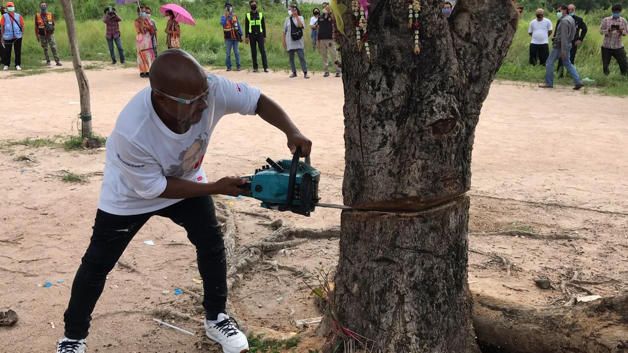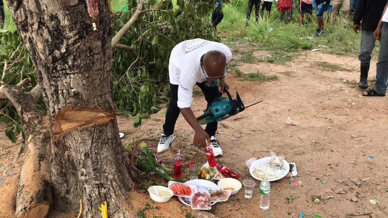 วันนี้ นายจีระพันธ์ เพชรขาว หรือ หมอปลา มือปราบสัมภเวสี พร้อมด้วย นายทินกร สุทิน ผู้อำนวยการโครงการชลประทานชลบุรี และนายธนา อุทาทิพย์ หัวหน้าฝ่ายส่งน้ำและบำรุงรักษาที่ 2 โครงการชลประทานชลบุรี ได้ร่วมเดินทางมาที่ต้นหว้าที่ถูกคนลักลอบตัดแต่ไม่ขาด โดยมีชาวบ้านที่ทราบว่าต่างเดินทางมาดูกันจำนวนมาก ทันที่หมอปลามาถึงได้นำเลื่อยยนต์มาตัดต้นหว้า จนขาด และเปิดเผยว่าที่สัมผัส ไม่มีผีสักตัว ไอ้พวกมโนเพ้อเจ้อ ฆ่าตัวตายเอง เสือกโทษต้นไม้ สาเหตุที่ต้องตัดเพราะมีคนมาลักลอบตัดเกือบจะขาดอยู่แล้ว หากปล่อยไว้ มีคนเข้ามาเล่นฟุตบอล ต้นไม้อาจล้มทับทำให้เสียชีวิตได้