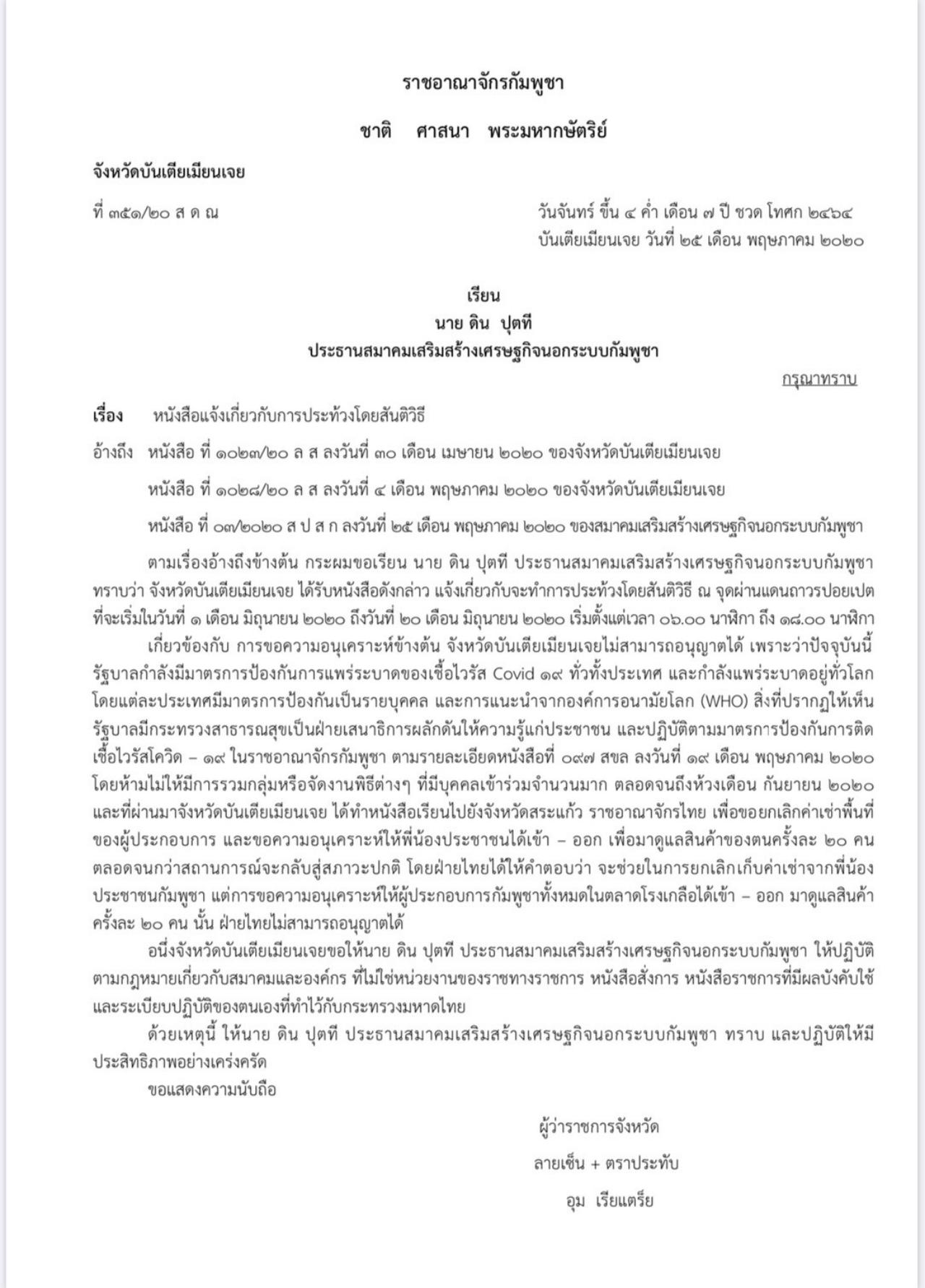 พ.ต.อ.อาทิตย์ ยาแก้ว ผกก.ตม.จว.สระแก้ว กล่าวว่า จากกรณีดังกล่าว เช้าวันนี้ทาง ผกก.ตม.ปอยเปต ประเทศกัมพูชา ได้แจ้งมาว่า นายอุม เรียแตร็ย ผวจ.บันเตียเมียนเจย ประเทศกัมพูชา ได้ทำหนังสือปฏิเสธไม่อนุญาตให้สมาคมเสริมสร้างเศรษฐกิจนอกระบบกัมพูชา ดำเนินการประท้วงประเทศไทยที่บริเวณด่านพรมแดนปอยเปตฯ ในวันที่ 1-7 พ.ค.63 นี้ อย่างเด็ดขาดแล้ว พร้อมทั้งได้จัดส่ง จนท.สห.(สารวัตรทหาร) ประจำจังหวัดบันเตียเมียนเจย ลงมาดูแลความสงบเรียบร้อยในพื้นที่ และห้ามชาวกัมพูชาสุมหัวชุมนุมกันอย่างเด็ดขาดด้วย เพราะประเทศกัมพูชามีกฎหมายห้ามชุมนุมอยู่แล้ว