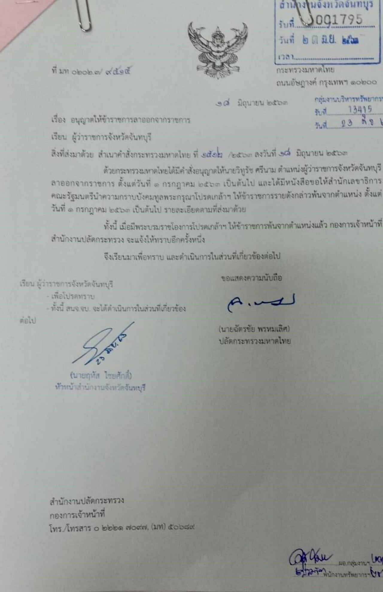 หลังจากได้มีหนังสือจากกระทรวงมหาดไทย (มท.) วันที่ 18 มิ.ย.63 ลงนามโดย นายฉัตรชัย พรหมเลิศ ปลัดกระทรวงมหาดไทย เรื่อง อนุญาตให้ข้าราชการลาออกจากราชการ หนังสือส่งถึง นายวิทูรัช ศรีนาม ผวจ.จันทบุรี โดยเนื้อหาระบุว่า