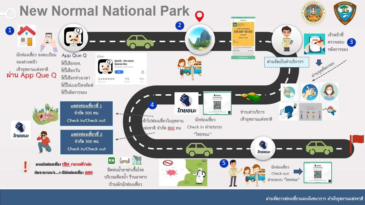นายจงคล้าย วรพงศธร รองอธิบดีกรมอุทยานแห่งชาติสัตว์ป่าและพันธุ์พืช กล่าวว่า ทางอุทยานฯ มีการเปิดระบบทดสอบนิวนอร์มอล ของอุทยานฯ เป็นการท่องเที่ยวรูปแบบใหม่ ที่อยู่ในสถานการณ์โควิด-19 มีการทดสอบระบบแอปพลิเคชัน QueQ ที่ คนทั่วไปสามารถดาวน์โหลดแอปพลิเคชันได้ทั้งทาง Play store และ App store คือ การจองคิวเข้ามาในเขตอุทยาน เมื่อเข้ามาแล้วต้องเช็กอินโดยผ่านระบบไทยชนะ เพื่อเป็นการควบคุมจำนวนนักท่องเที่ยว เมื่อนักท่องเที่ยวเข้าไปแล้วเราก็จะมีการควบคุมนักท่องเที่ยวในแต่ละแห่งอีก ก่อนออกไปก็จะมีการเช็กเอาต์อีกครั้ง ซึ่งระบบนี้เราสามารถควบคุมจำนวนนักท่องเที่ยวได้