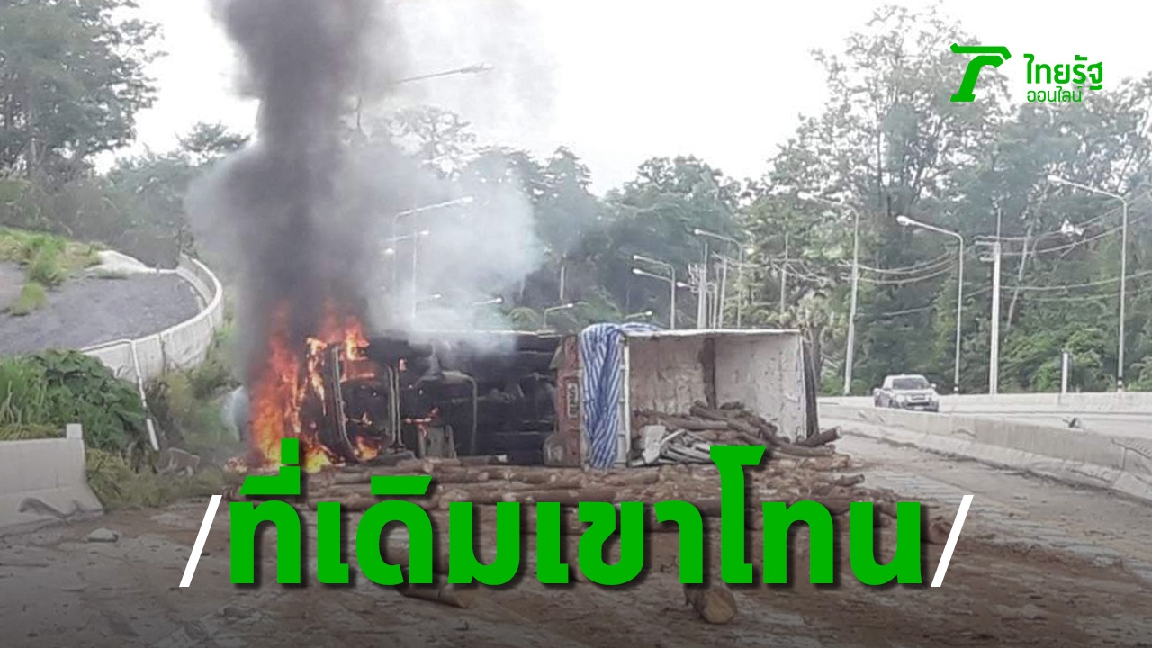 พ่วง 22 ล้อ บรรทุกไม้เต็มคัน วิ่งลงเขาโทน เกิดเบรกแตกคุมรถไม่อยู่ เสียหลักพลิกคว่ำ ไฟลุกท่วมคัน เจ็บ 2 หวิดย่างสด ทำรถสัญจรฝั่งตรงข้าม ถูกไม้กระเด็นใส่เสียหาย 2 คัน ต้องปิดถนน 304 นานเกือบ 2 ชม.