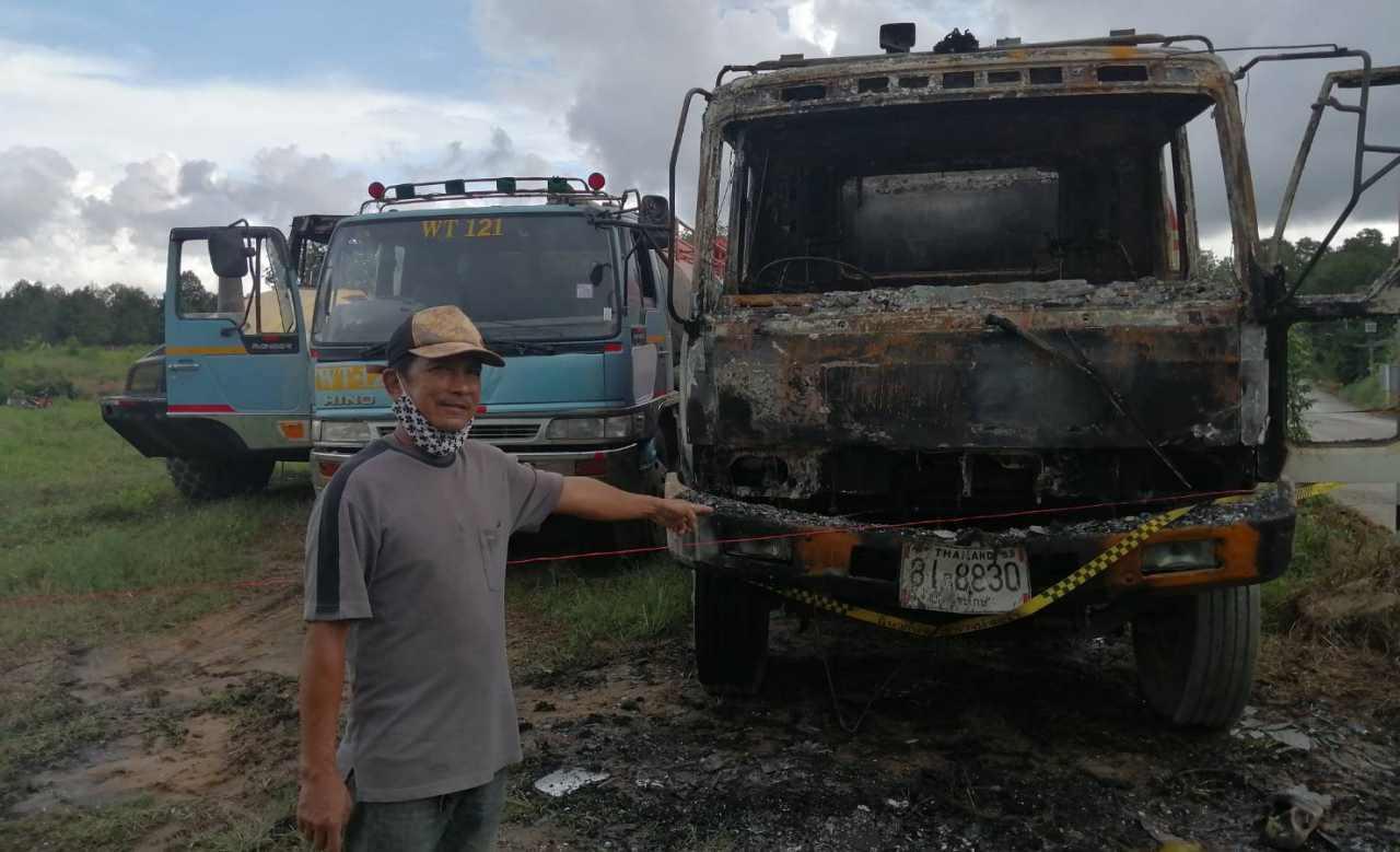 ที่เกิดเหตุพบรถบรรทุกสิบล้อบรรทุกน้ำ จำนวน 2 คัน รถบดอัดถนน 3 คัน จอดอยู่ริมถนน ในจำนวนนี้มีรถ 3 คัน ถูกไฟไหม้ได้รับความเสียหาย ประกอบด้วย รถบรรทุกน้ำ ยี่ห้อมิตซูบิชิ สีขาว-ส้ม ทะเบียน 81-8830 ศรีสะเกษ บริเวณหัวรถถูกเผาเสียหาย พบแกลลอนสังกะสีใส่ทินเนอร์ขนาด 3 ลิตร ตกอยู่ข้างประตูรถ