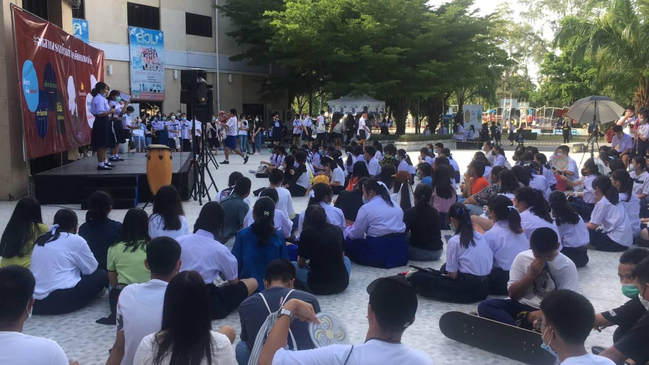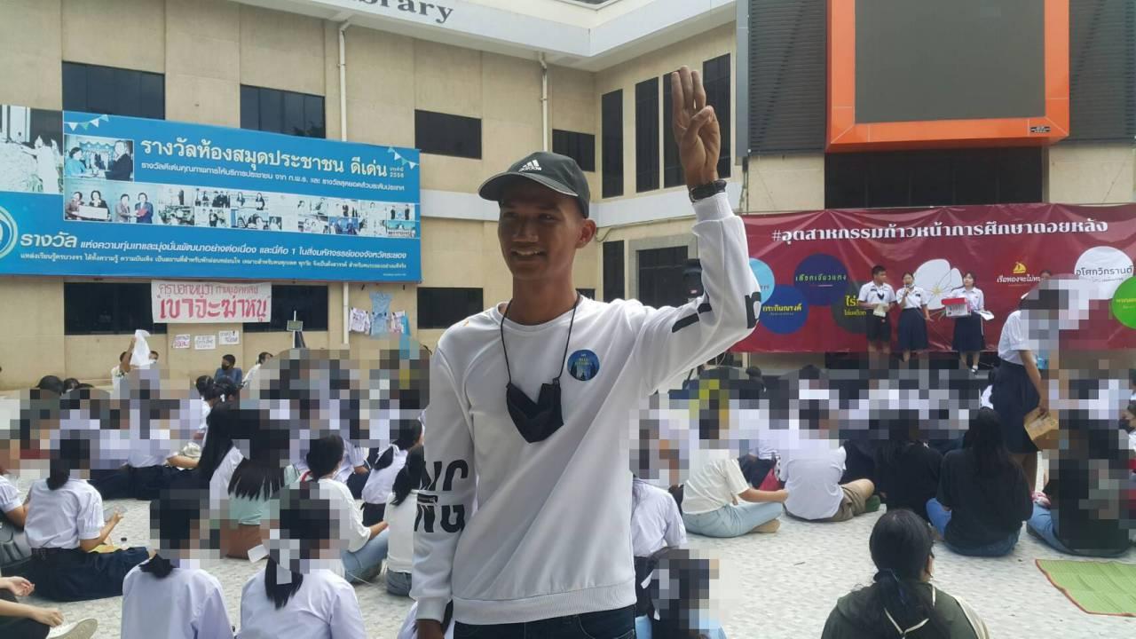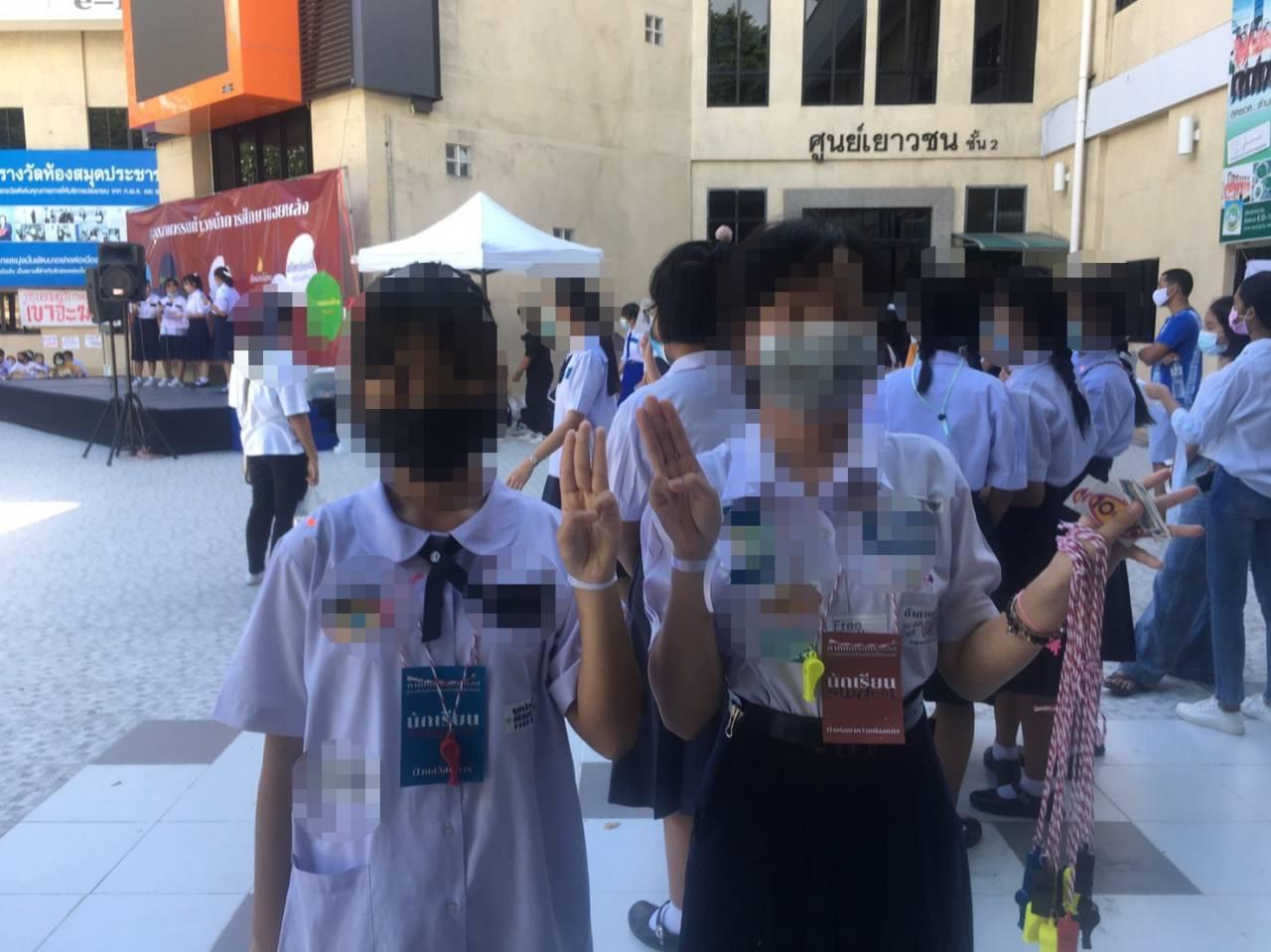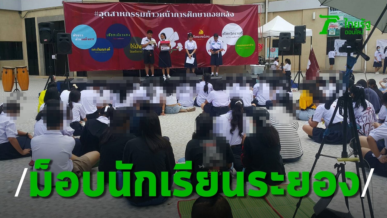 ไมค์ ระยอง โผล่ชู 3 นิ้วให้กำลังใจ ภาคีนักเรียนระยอง จาก 8 สถาบันโรงเรียนมัธยมระยอง ผูกริบบิ้นขาว ชุมนุมเปิดเวทีแสดงความคิดเห็นในหัวข้อ #อุตสาหกรรมก้าวหน้าการศึกษาถอยหลัง