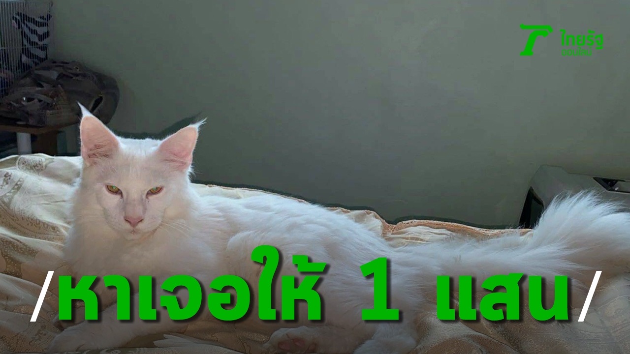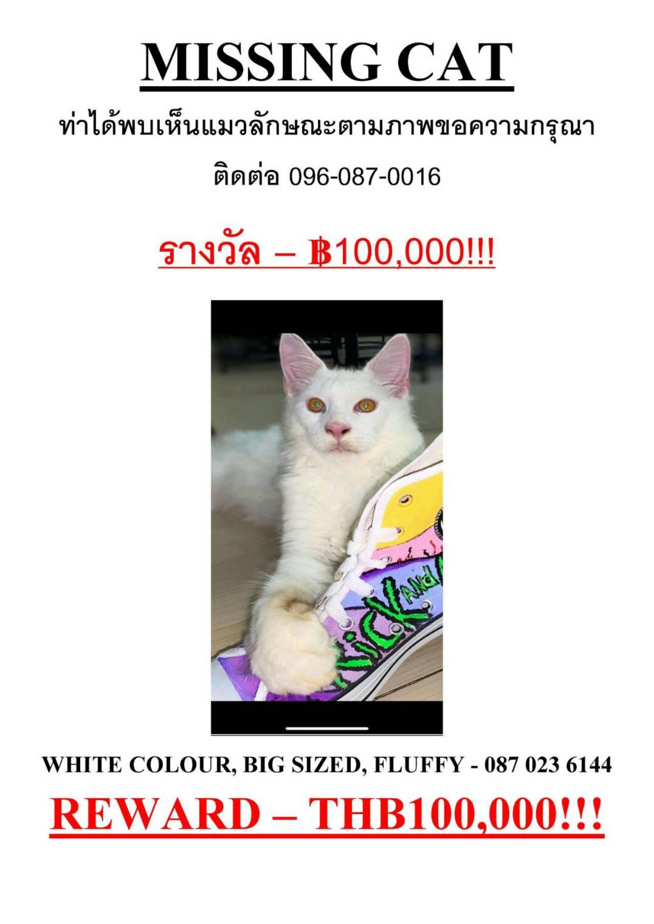 หญิงชาวรัสเซียที่ชลบุรี ประกาศตามหาแมวพันธุ์เมนคูน สีขาวปลอด วัย 9 เดือน หลังหายไปจากบ้าน เสนอให้รางวัล 100,000 บาท สำหรับผู้ที่พบเห็นและสามารถนำมาคืนได้