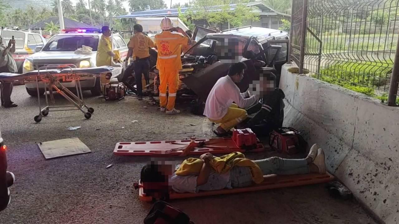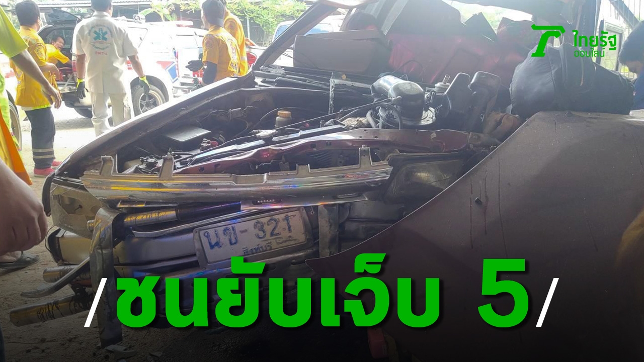 หนุ่มลพบุรี ขับรถไปตามจีพีเอสนำทาง จะพาเพื่อนเที่ยวหาดบางแสน กลับแหกโค้งอัดแท่งแบริเออร์ใต้สะพานกลับรถหนองข่า 5 ชีวิตหวิดดับยกคัน บาดเจ็บสาหัสติดคาซาก กู้ภัยต้องเร่งงัดเอาตัวออกมาส่ง รพ.