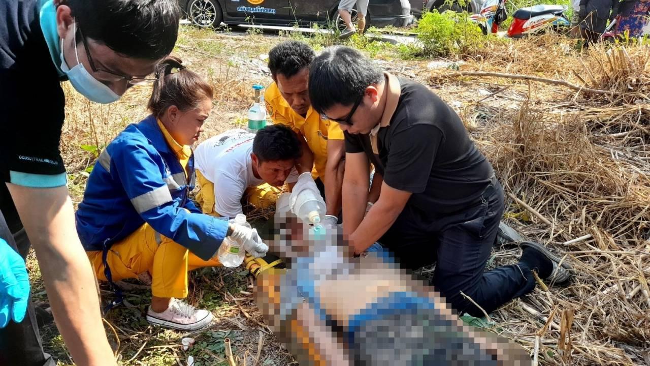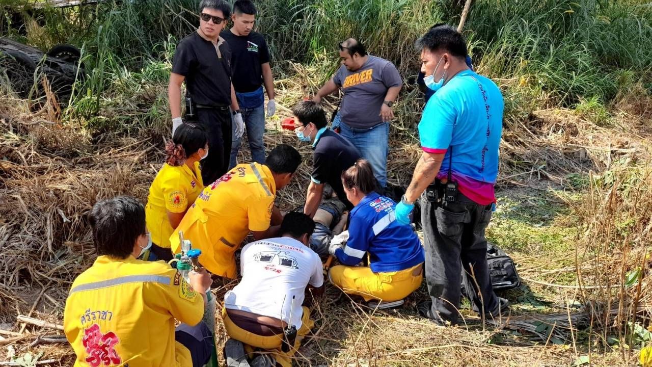 ที่บริเวณริมถนนพบรถยนต์เก๋ง ยี่ห้อ มาสด้า 2 สีแดง หมายเลขทะเบียน งพ-9236 ชลบุรี อยู่ในสภาพพลิกคว่ำ ล้อชี้ฟ้า พุ่งชนอัดติดกับต้นไม้ ตัวรถพังเสียหายยับเยิน ใกล้กันพบคนขับรถยนต์ทราบชื่อ คือ นายวชิระ พวงบุตร อายุ 40 ปี เป็นพนักงานโรงงานแห่งหนึ่งในนิคมอุตสาหกรรมปิ่นทอง 2 กระเด็นออกมานอกรถ นอนหงายหน้าหมดสติอยู่บนพื้นหญ้า ศีรษะแตก มีบาดแผลฉกรรจ์ที่บริเวณใบหน้าและลำตัว ขาซ้ายหัก แขนขวาหัก ซี่โครงหัก อาสากู้ภัยเพียวเยี้ยงไท้ศรีราชาจึงได้รีบปั๊มหัวใจเพื่อยื้อชีวิต ก่อนรอกู้ชีพลั่นทมมานำตัวส่งโรงพยาบาลแหลมฉบัง ให้แพทย์รักษาซึ่งทางแพทย์โรงพยาบาลแหลมฉบังแจ้งว่าได้เสียชีวิตขณะกู้ชีพลั่นทมนำตัวส่งโรงพยาบาลแหลมฉบัง