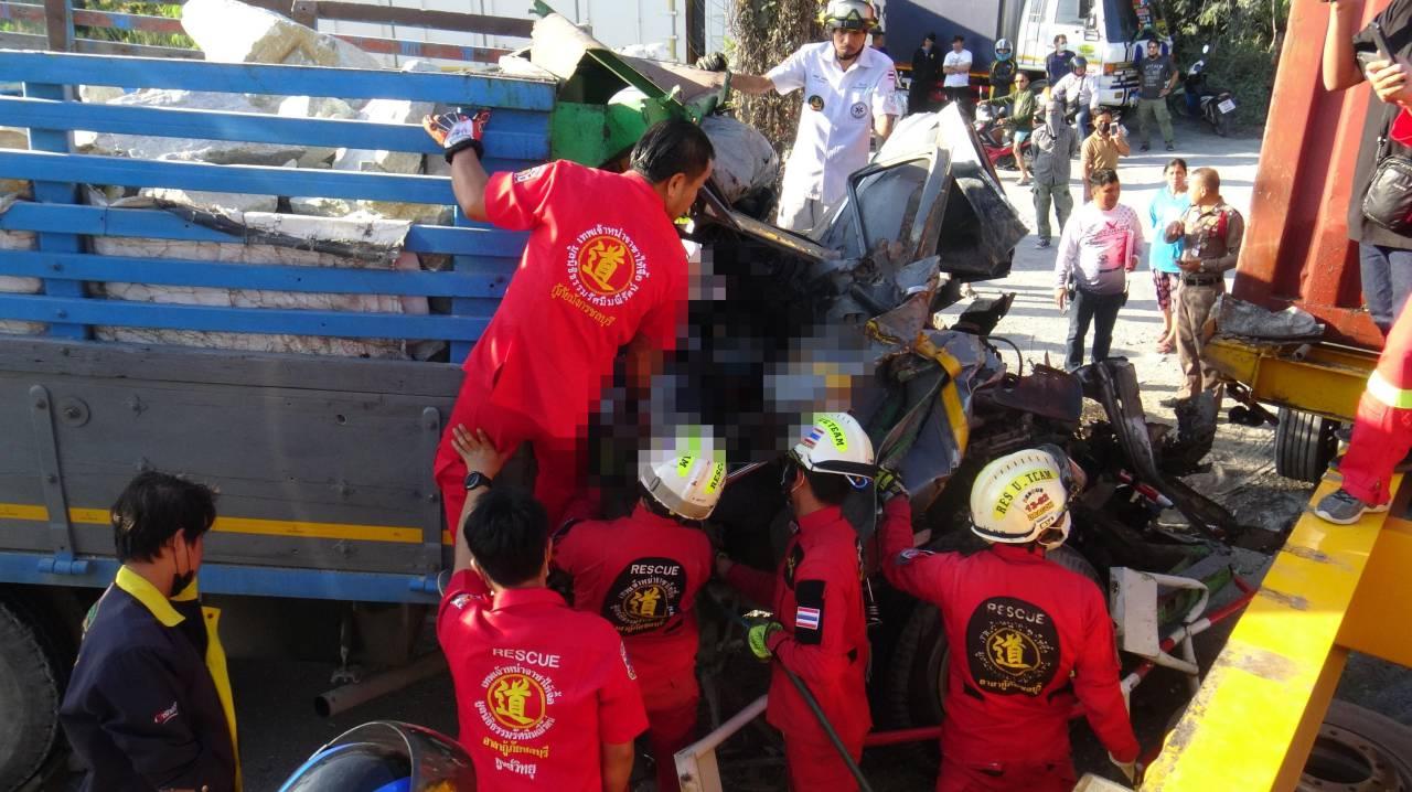 เมื่อวันที่ 8 ธ.ค.63 พ.ต.ท.นิธิศ ทองดี สว.(สอบสวน) สภ.เมืองชลบุรี รับแจ้งเหตุรถชนกันช่วงทางลงสะพานข้ามถนนมอเตอร์เวย์ หมู่ 5 ต.หนองข้างคอก จึงพร้อมกู้ภัยมูลนิธิธรรมรัศมีมณีรัตน์ รุดไปตรวจสอบพบรถบรรทุกหิน 10 ล้อ ยี่ห้ออีซูซุ หัวยาว สีเทา ทะเบียน 82 – 6087 ชลบุรี หน้ารถชนอัดติดกับหลังด้านซ้ายตู้คอนเทนเนอร์รถพ่วง 18 ล้อ ยี่ห้ออีซูซุ หัวสีขาว ทะเบียนส่วนหัว 73-7103 ชลบุรี ทะเบียนส่วนหาง 73 – 3620 ชลบุรี สภาพหน้ารถ 10 ล้อ พังยับเยิน โดยมี นายนิกิจ อุดม อายุ 54 ปี ถูกกระจังหน้ารถอัดก๊อบปี้นั่งเสียชีวิตติดอยู่กับเบาะที่นั่งคนขับ