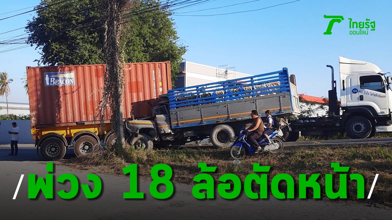 รถพ่วง 18 ล้อเลี้ยวขึ้นสะพานข้ามมอเตอร์เวย์ ตัดหน้ารถบรรทุกสิบล้อ ทำให้เบรกไม่ทันพุ่งชนเต็มแรง คนขับสิบล้อเสียชีวิตคาที่ บนถนนทางลงสะพานข้ามถนนมอเตอร์เวย์ ต.หนองข้างคอก จ.ชลบุรี