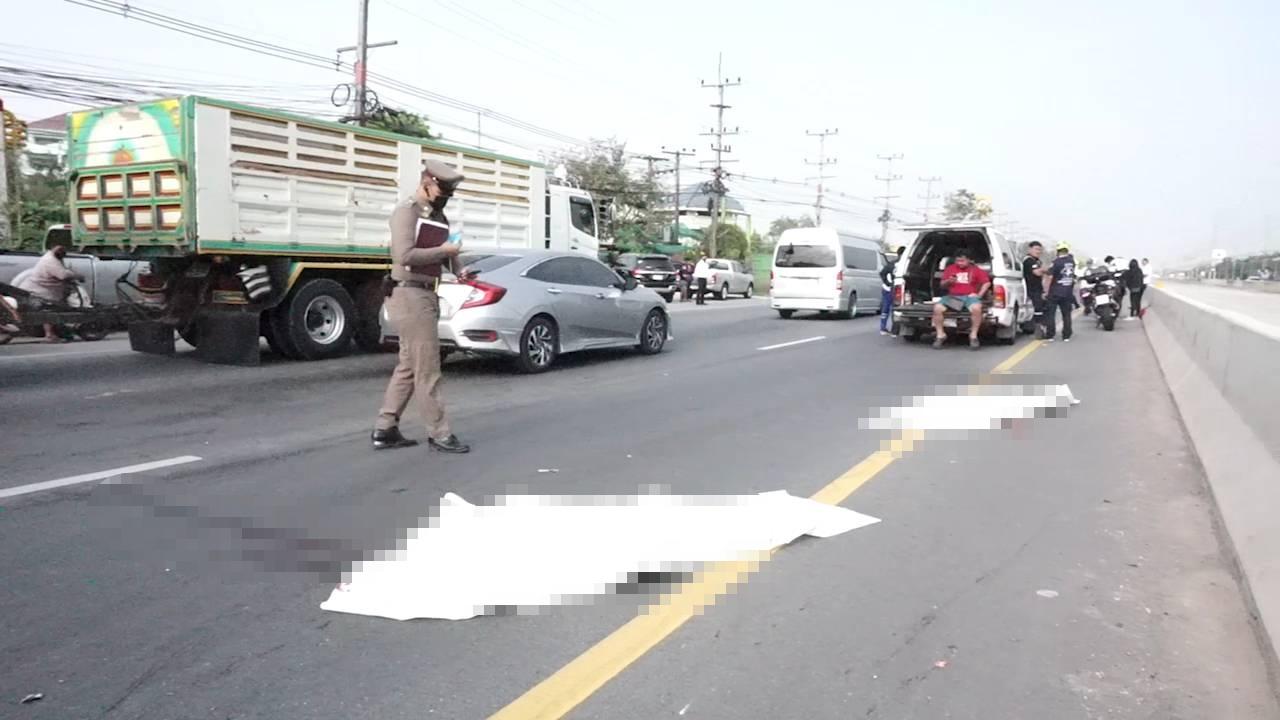 เศร้า 2 ตายายพระทักดวงไม่ดี มาใส่บาตรทำบุญแต่เช้า ก่อนข้ามถนนฉะเชิงเทรา-สุวินทวงศ์ เพื่อไปธนาคารรับเบี้ยคนชรา แต่โดนกระบะขับมาเร็วชนทั้งคู่กระเด็น 50 เมตร ตายคาที่ 2 ศพ ฟันกระบะขับรถโดยประมาท