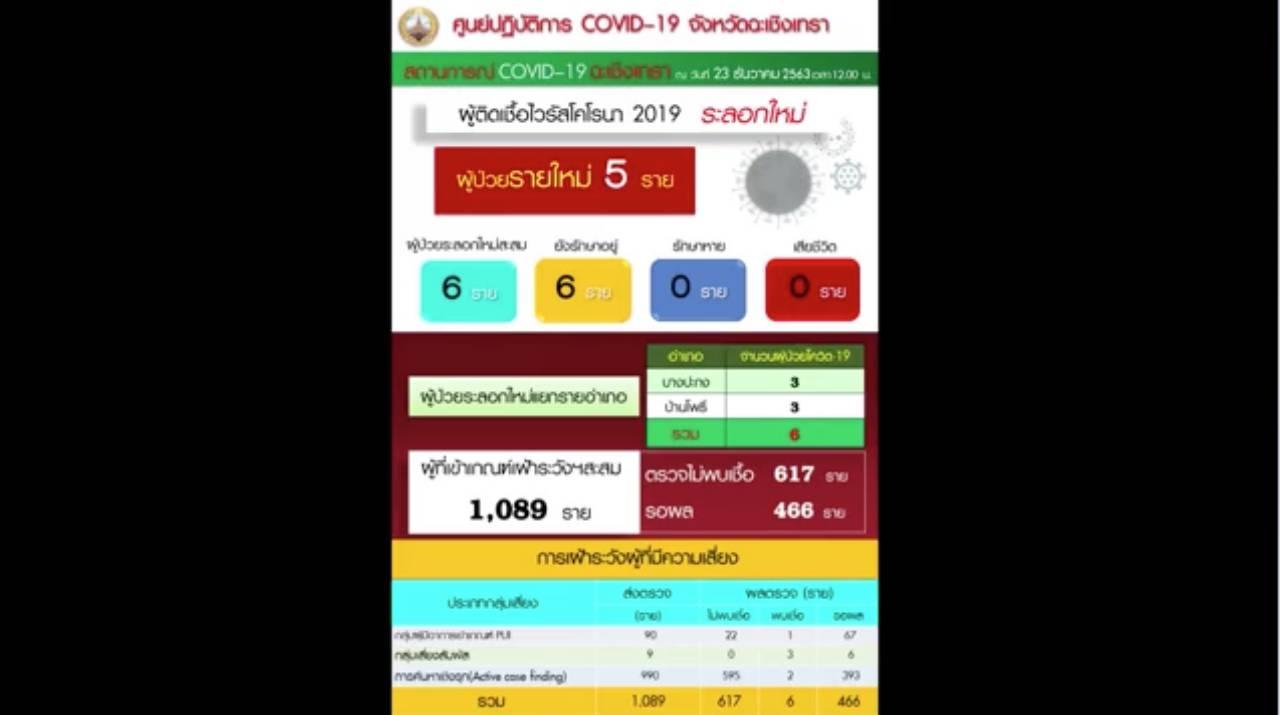 เมื่อเวลา 12.00 น. วันที่ 23 ธ.ค.63 หลังทาง ศบค.ออกมายืนยันพบผู้ป่วยติดเชื้อโควิด-19 เพิ่ม จำนวน 4 ราย อาศัยอยู่ในพื้นที่ อ.บ้านโพธิ์ จำนวน 3 ราย และ อ.บางปะกง จำนวน 2 ราย รวมจังหวัดฉะเชิงเทราติดโควิครอบใหม่แล้วรวม 5 ราย ประกอบด้วย อ.บางปะกง 3 ราย / อ.บ้านโพธิ์ 3 ราย รวม 6 ราย สำหรับผู้ติดเชื้อรายใหม่ พื้นที่บ้านโพธิ์นั้นเป็นชาย อายุ 39 ปี และ 43 ปี อาชีพรับส่งของทะเล และเป็นหญิง 1 ราย เป็นนักเรียน อายุ 17 ปี ส่วนผู้ป่วยอำเภอบางปะกงรายใหม่ เป็นหญิง 1 ราย อาชีพแม่บ้าน อายุ 52 ปี และเป็นหญิงอายุ 80 ปี ทั้งนี้ มีผู้ที่เข้าเกณฑ์เฝ้าระวังสะสม 1,089 ราย ตรวจไม่พบเชื้อ 617 ราย รอผล 466 ราย ขณะนี้ เจ้าหน้าที่สาธารณสุขจังหวัดฉะเชิงเทรา ได้ดำเนินการเข้าควบคุมและนำตัวเข้าสู่กระบวนการกักตัวแล้ว