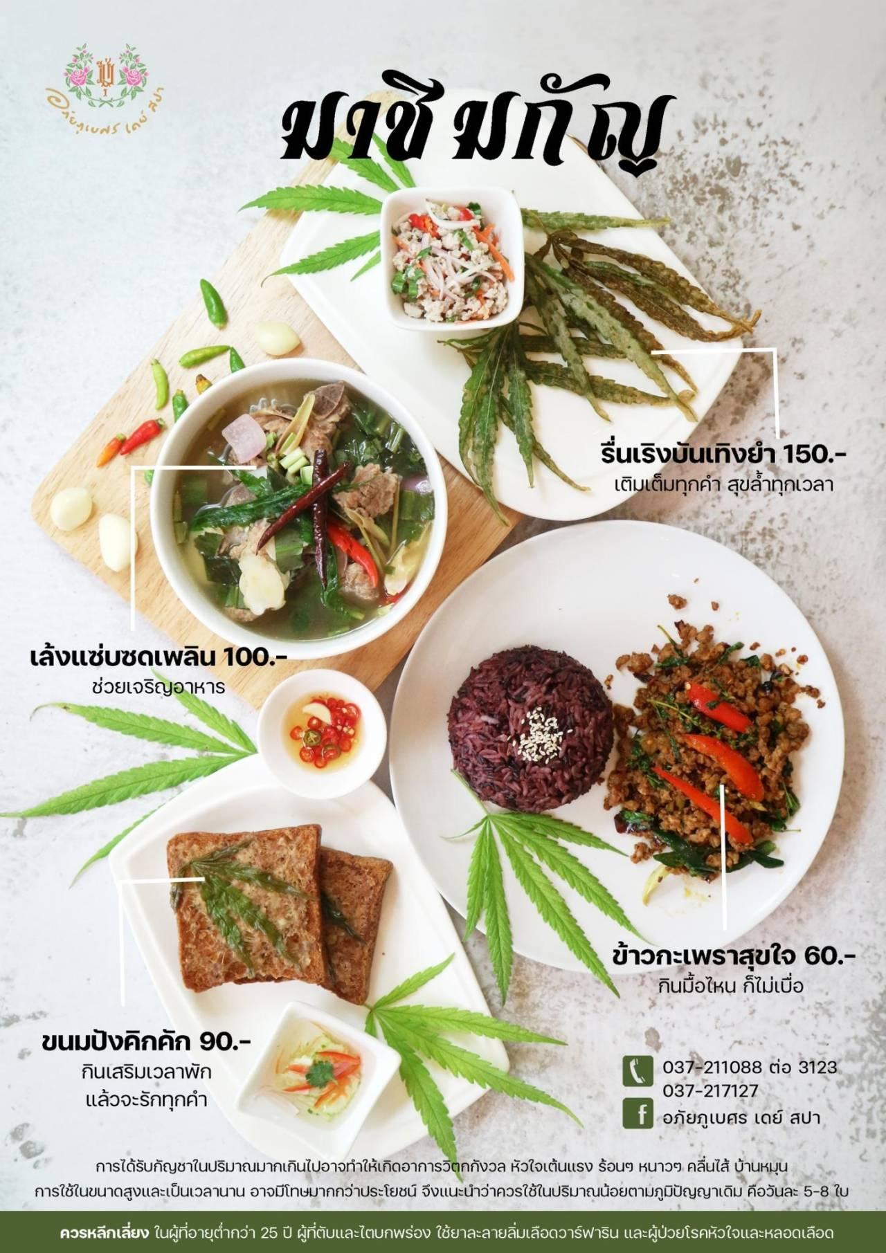 ส่วน เมนูอาหาร “รื่นเริงบันเทิงยำ” แพทย์แผนไทยประยุกต์ ฐานิตา บุญเชิด แพทย์แผนไทยปฏิบัติการอภัยภูเบศร เดย์ สปา บอกว่า มีส่วนประกอบ คือ ใบกัญชา แป้งทอดกรอบมีไว้สำหรับชุบใบกัญชาทอดกรอบ ส่วนเครื่องยำ ประกอบด้วย หมูสับรวนสุก เครื่องยำ มี หอมแดง แครอท มะเขือเทศ ผักชีฝรั่ง ผสมเครื่องปรุงมี พริก น้ำปลา มะนาว แล้วนำเครื่องยำมาผสมตามที่ชอบ แล้วใส่หมูบดผสมลงไปอีกครั้ง ส่วนใบกัญชาก็น้ำไปชุบแป้งทอดจนกรอบ ก็สามารถน้ำมารับประทานได้ทันที