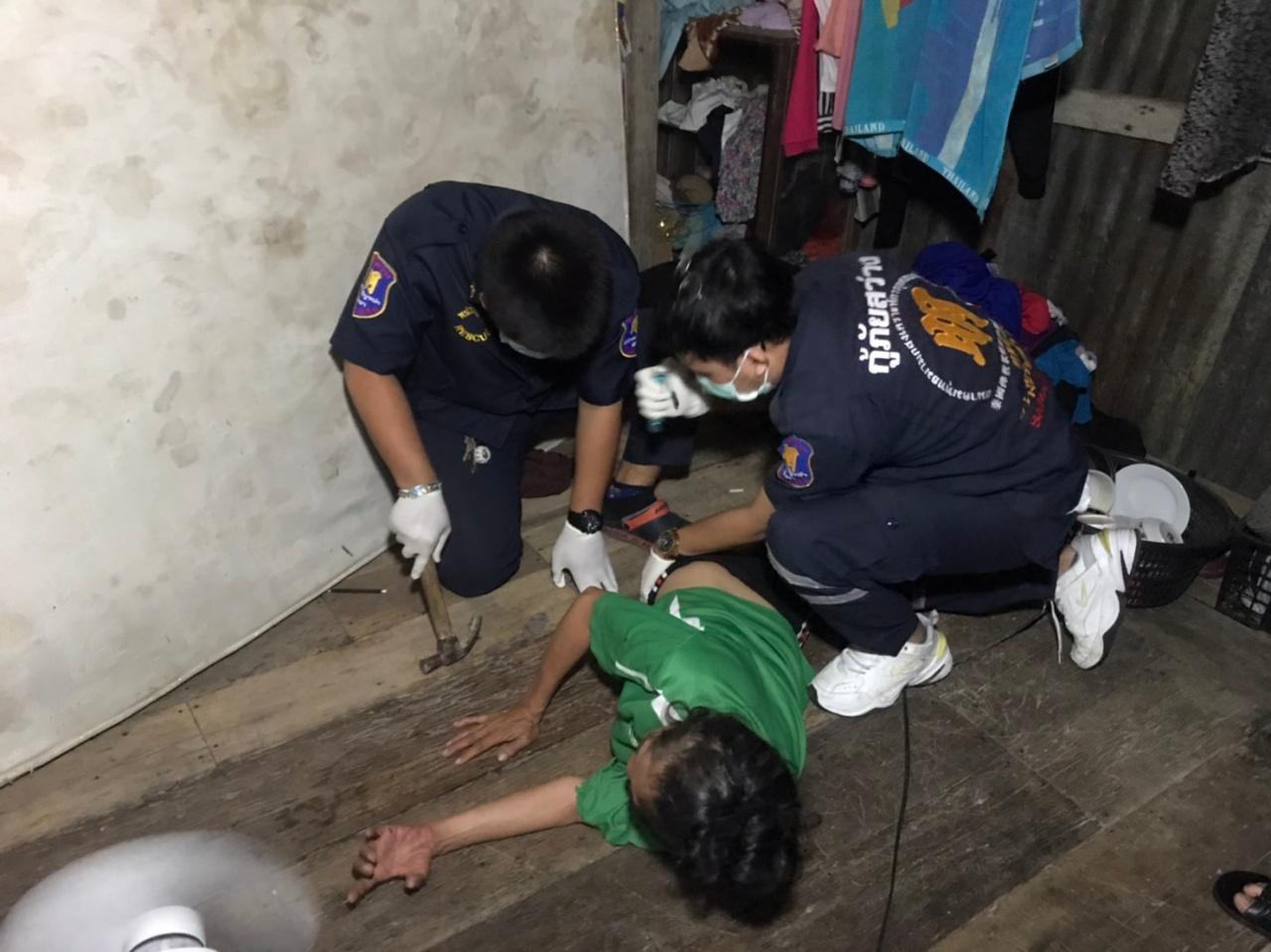 ที่เกิดเหตุเป็นบ้านไม้แบบยกพื้น พบมีเสียงร้องขอความช่วยเหลือดังออกมาจากภายในบ้าน เมื่อเข้าไปตรวจสอบจึงพบ นางยุพิน บัวจาน อายุ 51 ปี นอนอยู่กับพื้น ช่วงขาข้างขวาติดอยู่กับร่องไม้กระดานปูพื้นบ้าน ไม่สามารถนำขาขึ้นมาเองได้ เจ้าหน้าที่กู้ภัยต้องใช้ค้อนงัดไม้กระดานออก ก่อนจะนำร่างผู้บาดเจ็บขึ้นมาได้อย่างปลอดภัย แต่ขามีอาการปวดบวม เนื่องจากติดอยู่ในร่องขนาดเล็กเป็นเวลานาน จึงเคลื่อนย้ายส่งโรงพยาบาลอย่างเร่งด่วน