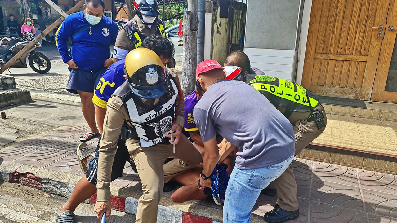 ตำรวจและชาวบ้านช่วยกันรุมล็อกตัวนายยนต์ อายุ 33 ปี ลูกเรือประมงชาวกัมพูชา ที่หน้าตลาดสัตหีบ จ.ชลบุรี หลังเครียดคิดถึงเมียกลับบ้านเกิดไม่ได้ ไปนั่งก๊งเหล้าขาว 1 ขวดและเสพยาไอซ์จนเกิดอาการหลอนพูดโวยวายลั่น.