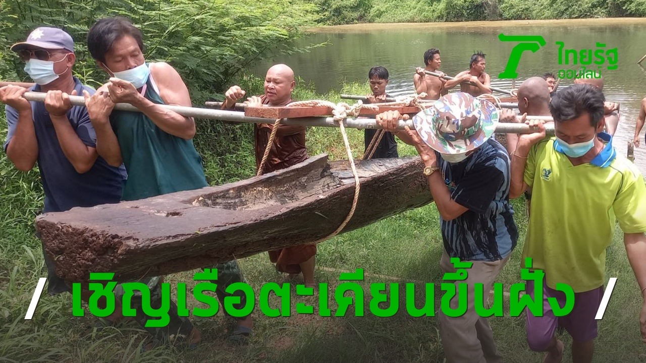 ต่อมาได้นำเรือตะเคียนขึ้นจากน้ำอย่างทะลักทุเล เพราะทางขึ้นตลิ่งลาดชันต้องใช้คนยกแบกหามไม่ต่ำกว่า 20 คน ขณะที่นำเรือขึ้นมาได้มีคุณยายท่านหนึ่งนั่งอยู่ด้านบนยกมือพนม พร้อมบอกว่า “แม่ตะเคียนมาโปรด มาสร้างความเจริญให้กับหมู่บ้าน” ส่วนเรือตะเคียนหลังจากที่ขึ้นจากน้ำแล้วพบว่ามีสภาพผุกร่อนตามกาลเวลา ก่อนที่จะนำไปไว้ที่ข้างอุโบสถ ท่ามกลางคอหวยที่ทราบข่าวมารอส่องหาเลขเด็ดอย่างไม่ขาดสาย แต่ก็ไม่ผิดหวัง เห็นเลขที่หัวเรือ มีเลข 15, 25 และ 55 บางรายถ่ายติดหน้าคนสร้างความขนลุก ส่วนเลขดังกล่าวสลากกินแบ่งรัฐบาลที่บรรดาพ่อค้า แม่ค้า มาขายถูกกว้านซื้อจนเกลี้ยงแผง
