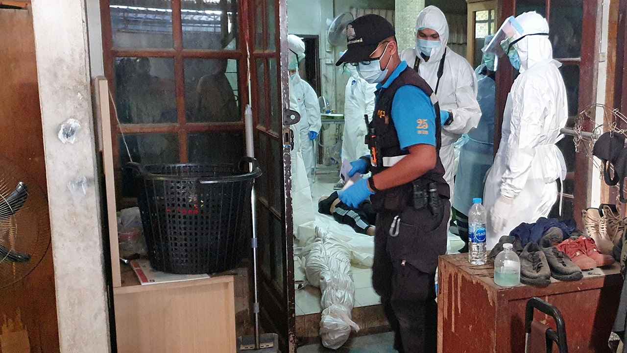 เจ้าหน้าที่ชันสูตรศพ น.ส.ปทิตตา เศรษฐเตชกุล กรอกยาพิษปลิดชีพนางทองคำ พรหมเมือง แม่วัยชรา ก่อนซดยาฆ่าตัวตายตาม 2 ศพ ในบ้านเลขที่ 75 หมู่ 8 ต.โป่ง อ.บางละมุง จ.ชลบุรี ปมเครียดหนี้สินโดนโกงธุรกิจ.