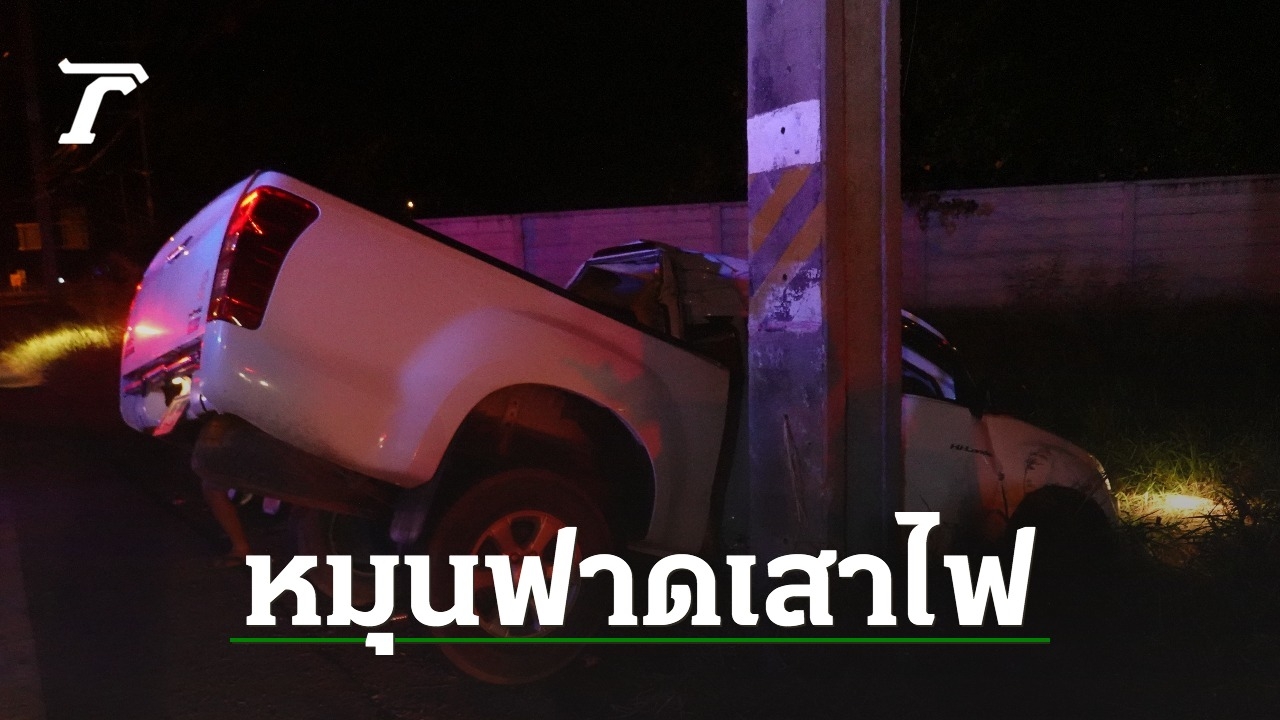 กระบะเสียหลักฟาดเสาไฟข้างทางเต็มแรง 3 ชีวิตเจ็บสาหัสติดภายใน กู้ภัยรุดช่วยได้ทัน หามส่ง รพ. ตำรวจคาดขับมาเร็วหลุดโค้ง หมุนฟาดเสาไฟ