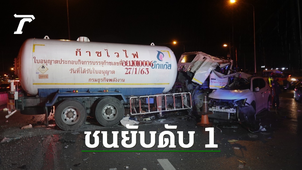 รถบรรทุกแก๊ส ชนแท็กซี่ พุ่งเสยแบริเออร์ ข้ามเลนประสานงารถเก๋งอีกฝั่ง พังยับทั้งคู่ บนถนนมอเตอร์เวย์ ช่วง อ.บางปะกง มีคนเจ็บ 2 ตาย 1 รถคันอื่นได้รับความเสียหาย 6 คัน