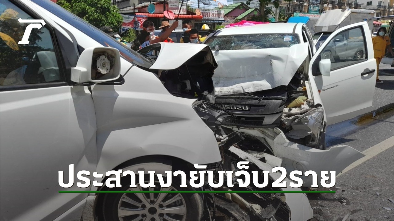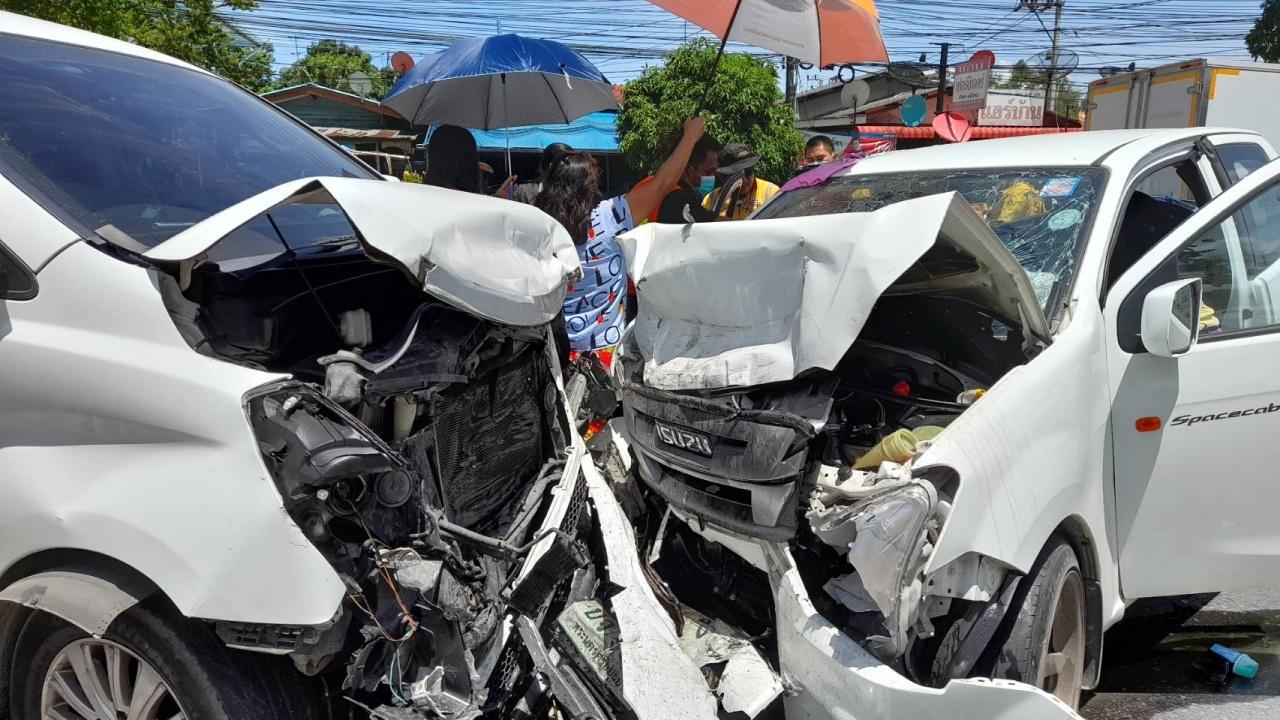 สาวขับรถตู้แซงรถบรรทุก 18 ล้อ ไม่พ้นพุ่งชนประสานงากระบะที่วิ่งสวนทางมาจนคนขับรถกระบะติดภายในบาดเจ็บสาหัส 2 ราย บนถนนสายวงเวียนเขาชี-สวนเสือ อ.ศรีราชา จ.ชลบุรี