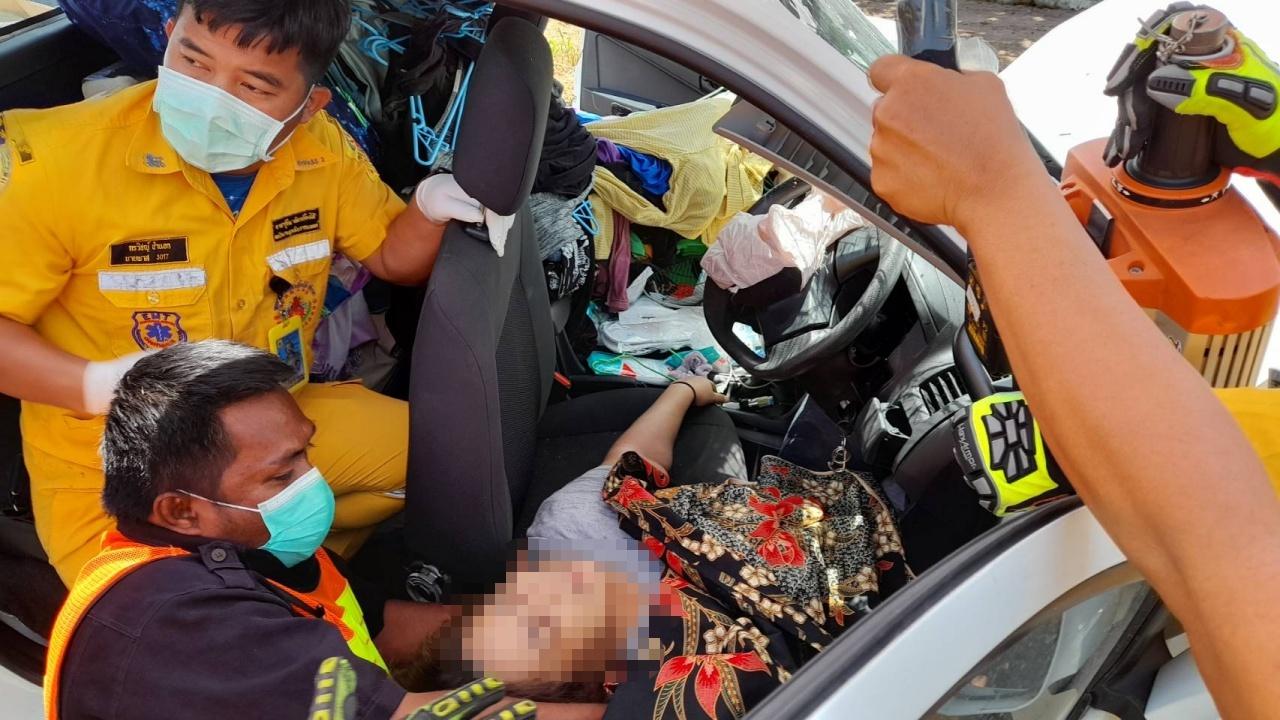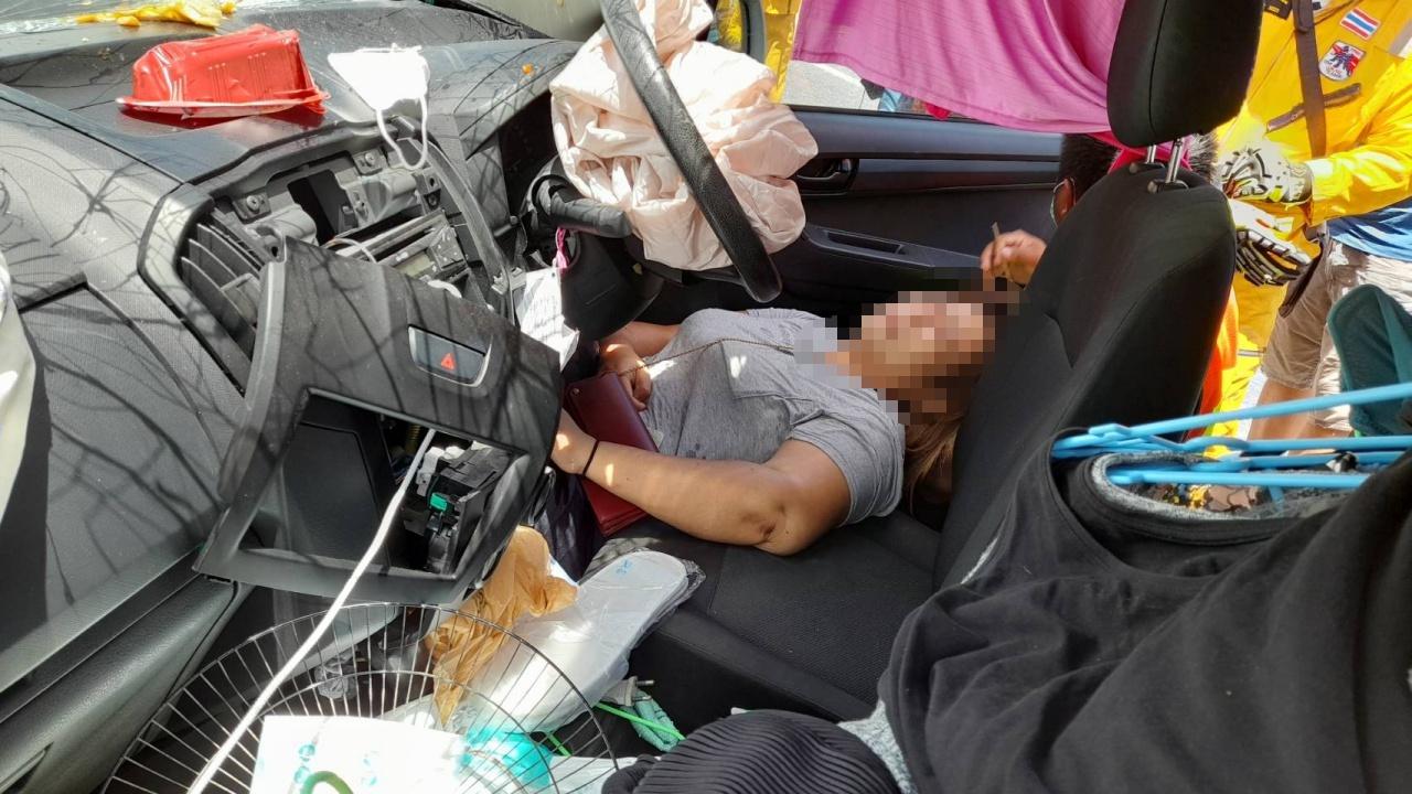 บริเวณจุดเกิดเหตุพบเจ้าหน้าที่กู้ภัยเพียวเยี้ยงไท้ศรีราชา กำลังใช้เครื่องตัดถ่างบริเวณช่วงประตูคนขับรถกระบะอีซูซุ ดีแมคซ์ สีขาว หมายเลขทะเบียน บว-9860 พระนครศรีราชา เพื่อนำร่างคนขับซึ่งเป็นหญิงสาวออกมาจากรถ โดยพบว่ามีคอนโซลหน้ายุบตัว กดทับขาทั้ง 2 ข้างไว้ ซึ่งใช้เวลานานกว่า 25 นาที จึงนำร่างของนางศศิพิมพ์ ลวรรณวงษ์ อายุ 40 ปี ที่บาดเจ็บสาหัสที่กระดูกบริเวณขาผิดรูปทั้ง 2 ข้างจนกระดูกโผล่ออกมา และเจ็บอย่างรุนแรงช่วงหน้าอก เพราะกระแทกอย่างแรงจากพวงมาลัยรถยนต์ อาการสะลึมสะลือ หลังนำตัวออกมาได้ทางหน่วยกู้ชีพลั่นทม ซึ่งเดินทางมาตรวจสอบเหตุร่วมจากศูนย์สั่งการ การแพทย์ฉุกเฉินได้รีบนำตัวส่งโรงพยาบาลสมเด็จพระบรมราชเทวี ณ ศรีราชา ให้แพทย์รักษาอาการอย่างเร่งด่วน