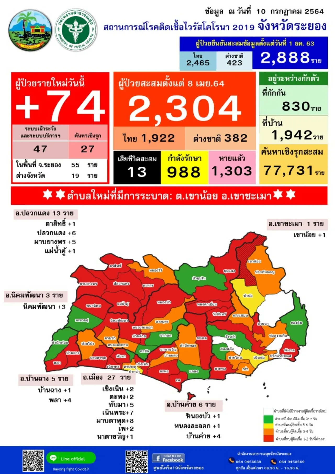 เมื่อวันที่ 10 ก.ค.64 ศูนย์ปฏิบัติการฯโควิด-19 ระยอง โดยนายชาญนะ เอี่ยมแสง ผู้ว่าราชการจังหวัดระยอง รายงานสถานการณ์การแพร่ระบาดโควิด-19 ของจังหวัดระยองว่า วันนี้พบผู้ติดเชื้อโควิด-19 รายใหม่เพิ่มอีก 74 ราย ยอดเสียชีวิตสะสม 13 ราย ผู้ป่วยสะสมตั้งแต่วันที่ 8 เม.ย.-10 ก.ค.64 จำนวน 2,304 ราย รักษาหายแล้ว 1,303 ราย กำลังอยู่ระหว่างรักษา 988 ราย มีการค้นหาเชิงรุก 77,731 ราย มีกลุ่มที่ได้รับการกักตัวใน LQ และ HQ จำนวน 830 ราย และกักตัวที่บ้าน 1,942 ราย โดยพบผู้ติดเชื้อใน 6 อำเภอของจังหวัดระยอง อยู่ใน อ.เมืองระยอง 27 ราย อ.ปลวกแดง 13 ราย อ.บ้านค่าย 6 ราย อ.บ้านฉาง 5 ราย อ.นิคมพัฒนา 3 ราย อ.เขาชะเมา 1 ราย และต่างจังหวัดเข้ามารักษาตัว 19 ราย