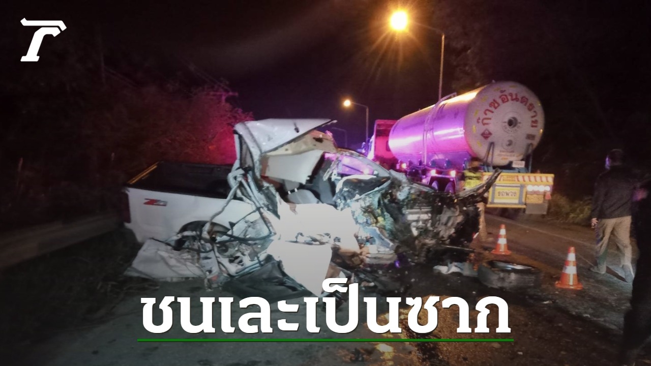 "กระบะ-สิบล้อ" ประสานงากันยับ คนขับกระบะตายคาซาก 1 ส่วนโชเฟอร์สิบล้อเผ่นหนี ตำรวจเผยจุดเกิดเหตุเป็นทาง 2 เลน-รถวิ่งสวนกัน ไร้ไฟส่องสว่าง คาดต้องมีคันใดคันหนึ่งเสียหลักข้ามเลนมาชนอีกคัน