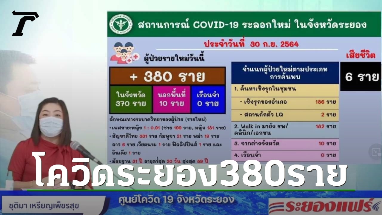 เมื่อวันที่ 30 ก.ย. 64 ศูนย์ปฏิบัติการฯ โควิด-19 ระยอง โดยนายชาญนะ เอี่ยมแสง ผู้ว่าราชการจังหวัดระยอง รายงานสถานการณ์การแพร่ระบาดโควิด-19 ของจังหวัดระยองว่า วันนี้พบผู้ติดเชื้อโควิด-19 เสียชีวิตเพิ่ม 6 ราย รายแรกเป็นเพศชาย อายุ 65 ปี อยู่ ต.ตาสิทธิ์ อ.ปลวกแดง มีโรคประจำตัว ความดันโลหิตสูง หลอดเลือดสมอง เข้ารับการรักษาตัวที่ รพ.ปลวกแดง วันที่ 5 ก.ย. เสียชีวิตวันที่ 28 ก.ย. รายที่ 2 เป็นเพศชาย อายุ 27 ปี อยู่ ต.สำนักท้อน อ.บ้านฉาง มีโรคประจำตัว โรคอ้วน เข้ารับการรักษาตัว รพ.นิคมพัฒนา วันที่ 24 ก.ย. ส่งต่อ รพ.ระยอง เสียชีวิตวันที่ 29 ก.ย. รายที่ 3 เป็นเพศหญิง อายุ 77 ปี อยู่ ต.ปากน้ำ อ.เมืองระยอง มีโรคประจำตัว ไขมันในเลือดผิดปกติ หัวใจ และความดันโลหิตสูง เข้ารับการรักษาตัวที่ รพ.สนามชมดาว วันที่ 20 ก.ย. ส่งต่อ รพ.ระยอง เสียชีวิตวันที่ 28 ก.ย.